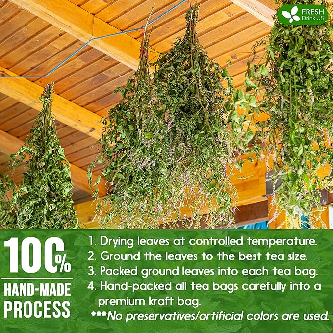 - ☘️ SPEARMINT TEA BAS MADE BY A HAND-MADE PROCESS: Spearmint leavess are picked at their flavorful/colorful peak and naturally sun-dried to perfection. We hand-select only the premium leaves of Spearmint for the utmost quality. Then we grind the herbal leaves into the best tea size. Next, we immediately pack it in eco-friendly tea bags. Lastly, we pack the tea bags into food-grade kraft bags for ultimate freshness.