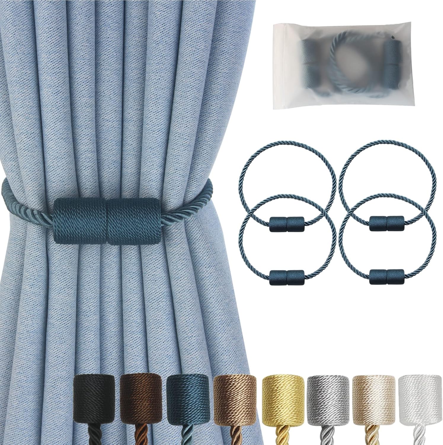 - High-Quality Materials- Magnetic curtain tie backs use an upgraded version of nickel-plated magnets, which are strong and smooth. The brightly colored twisted woven texture rope is hand-woven with premium polyester materials. very soft and good feeling. Beige/Gold/Black/White/Grey/Khaki/Coffee/Blue -Eight colors to choose from