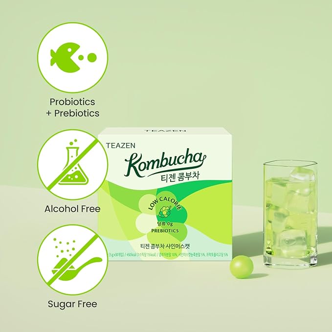 TEAZEN Shine Muscat Kombucha Tea, Electrolyte & Hydration Drink Mix, Sugar Free, Live Probiotics & Prebiotics, 30 Sticks, 5.29oz