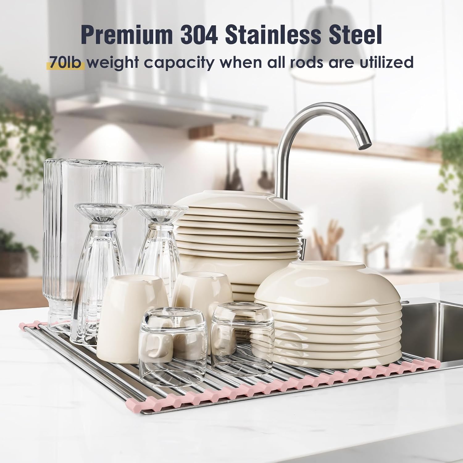 Tomorotec 17.7" x 15.5" Roll Up Dish Drying Rack Over Sink Drying Rack Sink Cover Kitchen Sink Accessories Gadget Multipurpose Organizer Foldable Stainless Steel Drainer