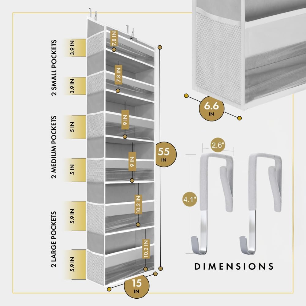 - 🏡Premium Closet Organizers And Storage: Crafted from the highest quality non-woven fabric, Homelux Theory's Over Door Organizer Hanging Storage solution has exceptional durability and moisture-proof properties, all while maintaining a lightweight, breathable, and luxuriously soft-to-touch feel. Measuring 55"x14"x6.7", this behind the door organizer, bathroom door organizer and diaper storage organizer making it an absolute small closet organizer.