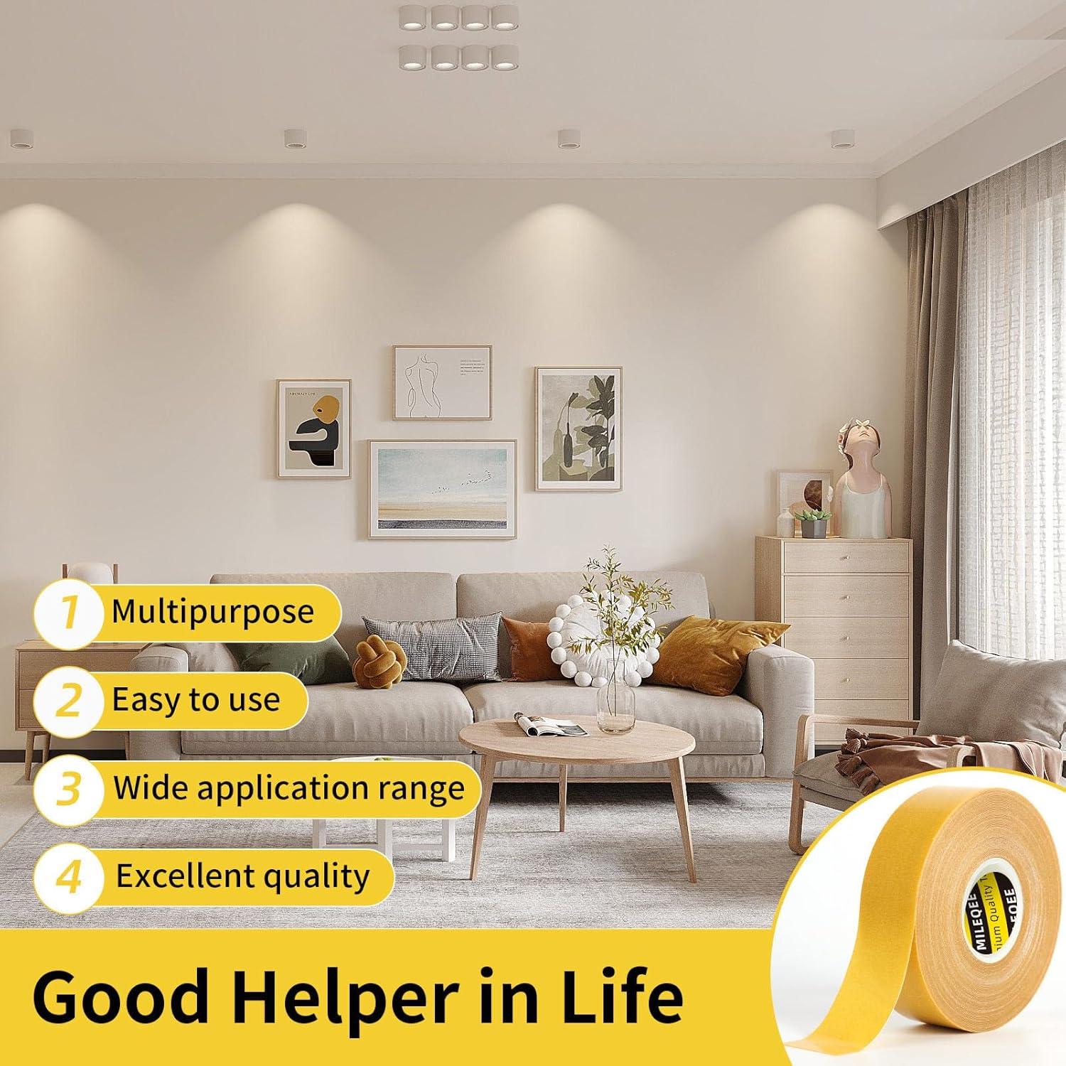 - PROFESSIONAL DOUBLE SIDED TAPE- The double sided mounting tape is made of upgraded PE material and extra strength cloth mesh, coated with extremely sticky clear glue under industrial standard, providing premium grade quality and easy use for home, office, school etc.
