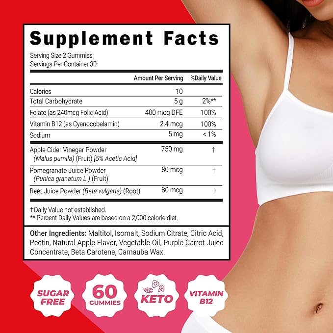 - INGREDIENTS – Apple cider vinegar powder, pomegranate juice powder, beet juice powder, vitamin B12, among others. And with no added sugar, these gummies are perfect for those looking to maintain a healthy diet