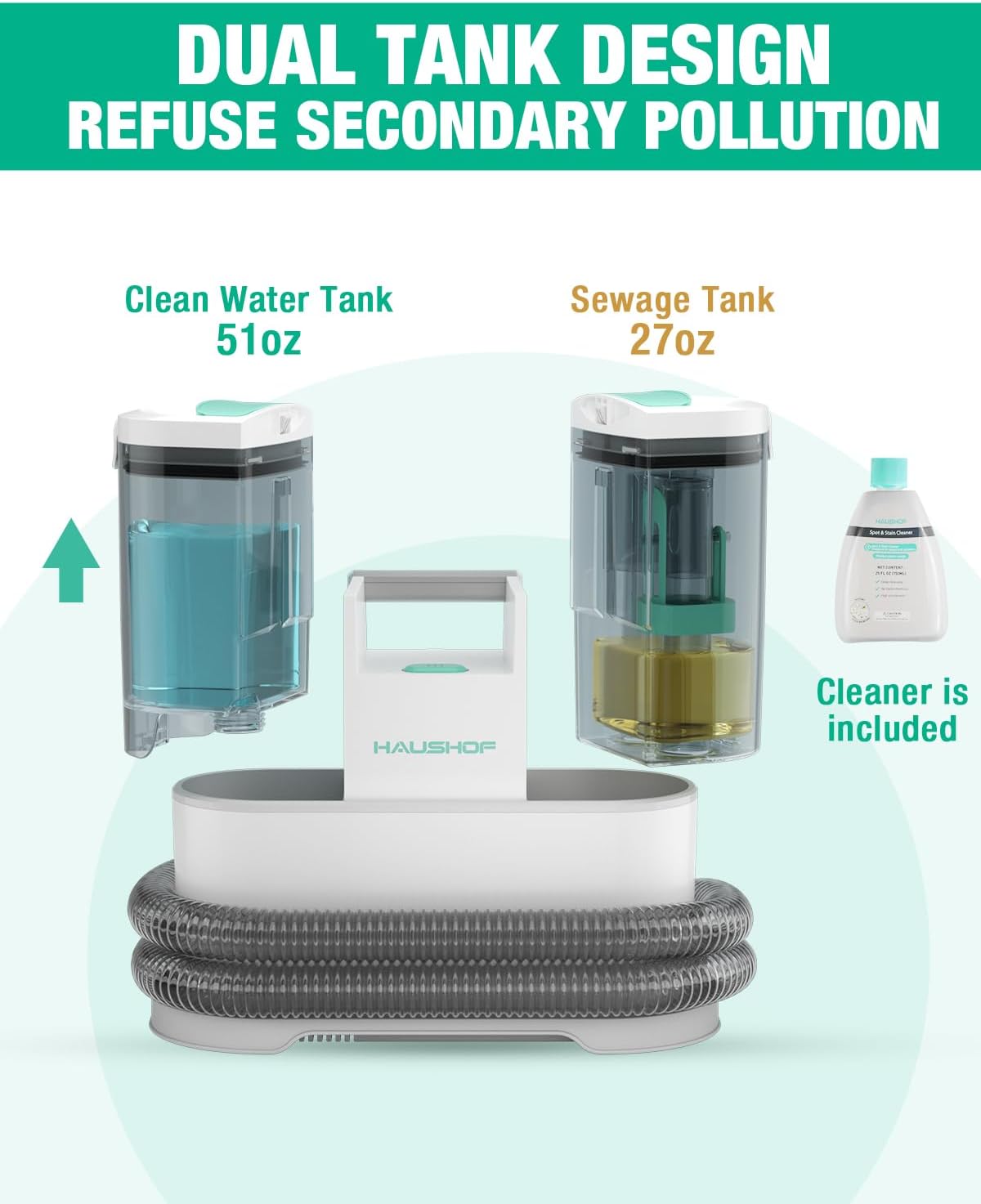 - Double Tank Design for Easy Cleaning: The upholstery cleaner machine stores a 27 oz sewage tank and a 51 oz clean water tank separately and detachable, allowing you to fill, empty, and rinse them with ease. Experience enjoyable, uninterrupted cleaning and maintain a hygienic environment