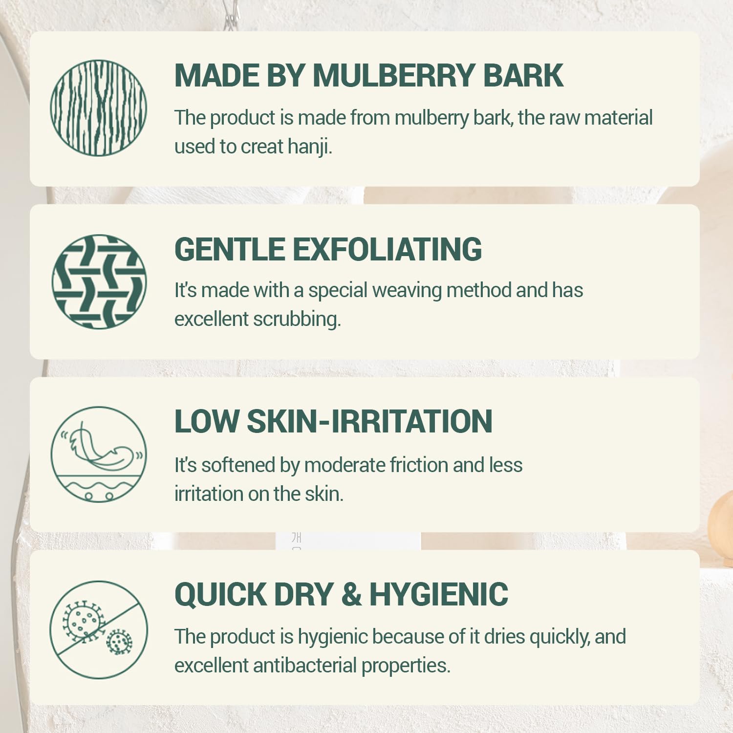- SOFT ON SKIN: Steeped in tradition and made with skin-safe material-Hanji (Korean mulberry bark fabric), our exfoliating towel assures a gentle touch. Experience no skin stimulation; instead, enjoy the gentle scrubbing action that will leave your skin vibrantly rejuvenated