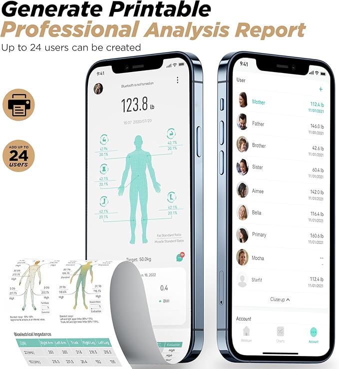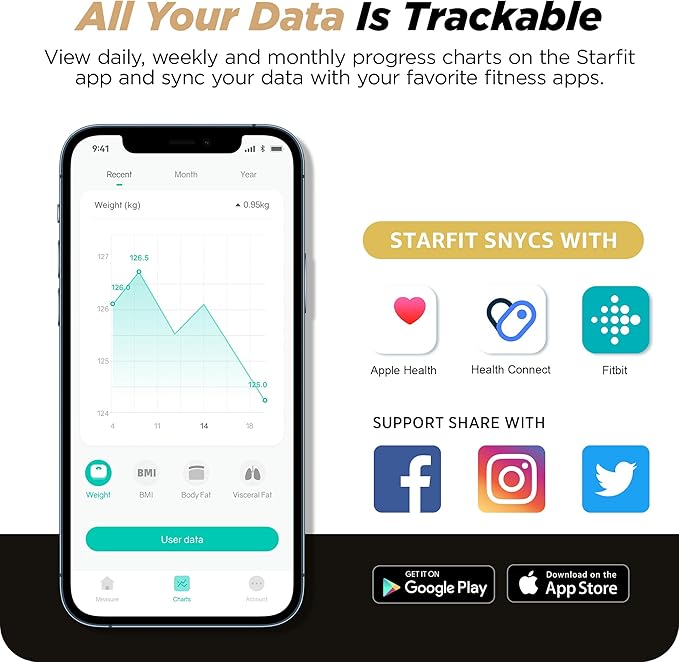 - SMARTER APP FOR TRACKING AND SHARING: The Starfit app allows you to view detailed measurements of 20 body components and generate a printable professional report. You can track data changes by day, week, month, and year through the APP, and you can also synchronize data with popular fitness apps Apple Health, Health Connect, and Fitbit