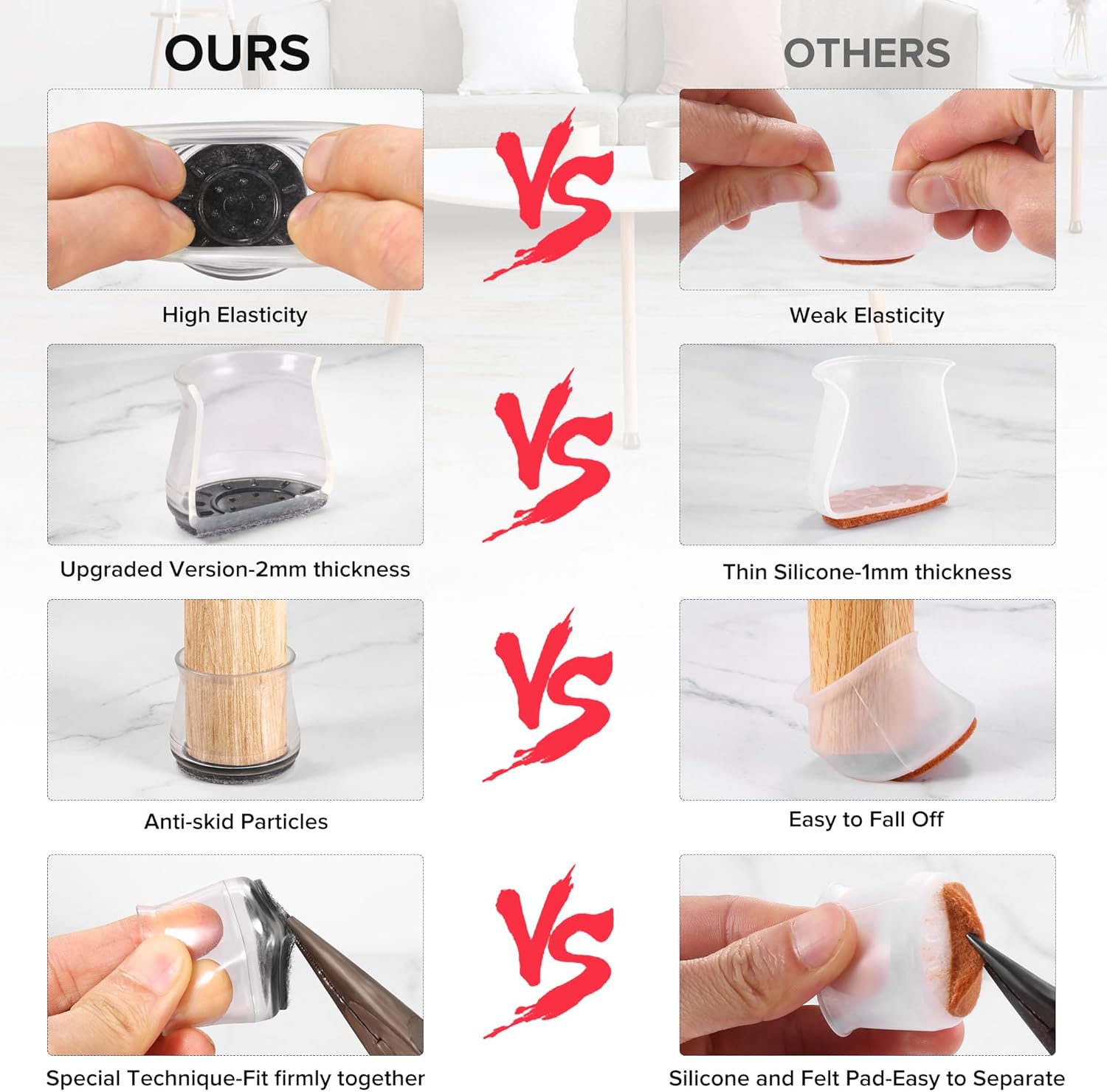 • ✅【Latest Upgrade】Compared with most of the traditional 1mm furniture pads on the market, our silicone chair leg protectors are made of 2mm thick silicone, which will never be damaged, durable. The ruby for chair legs will not change color when stretched. Inside of the inner sleeves are particles with anti-slip, which will firmly fix the chair and never make the covers fall off. Felt pads at the bottom make your furniture move silently and smoothly along floors without leaving marks and noise.