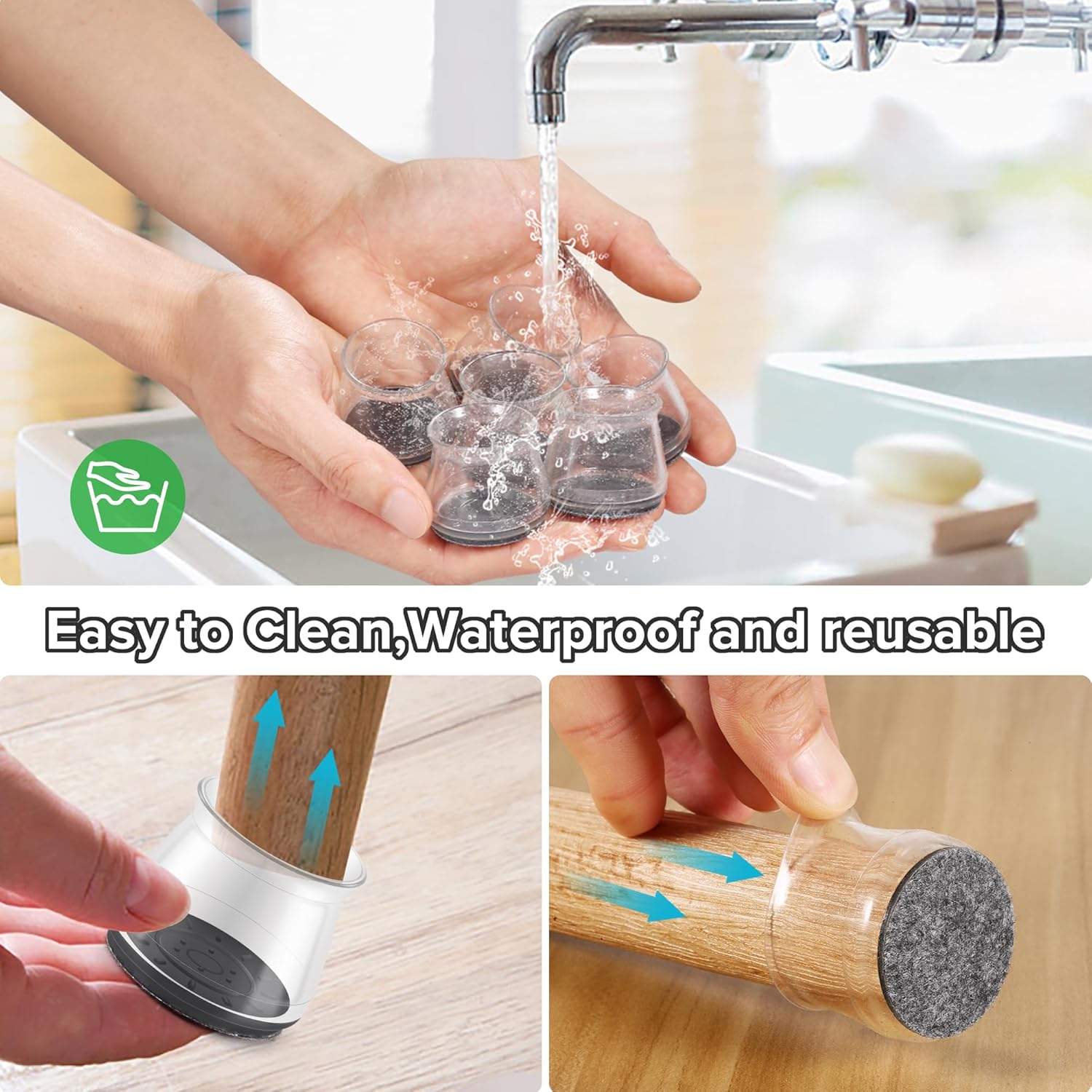 • ✅【Easy to Use】The chair leg covers to protect floors has high transparency, which greatly restore the original color of the table and chair legs, look more natural. The furniture leg cap is easy to install, without the use of tools. When the furniture chair socks are dirty, the chair stoppers can be cleaned and used repeatedly. Mainly suitable for smooth floors such as hardwood, tile, composite floor, and vinyl floor. Clear cap style match with most floors.
