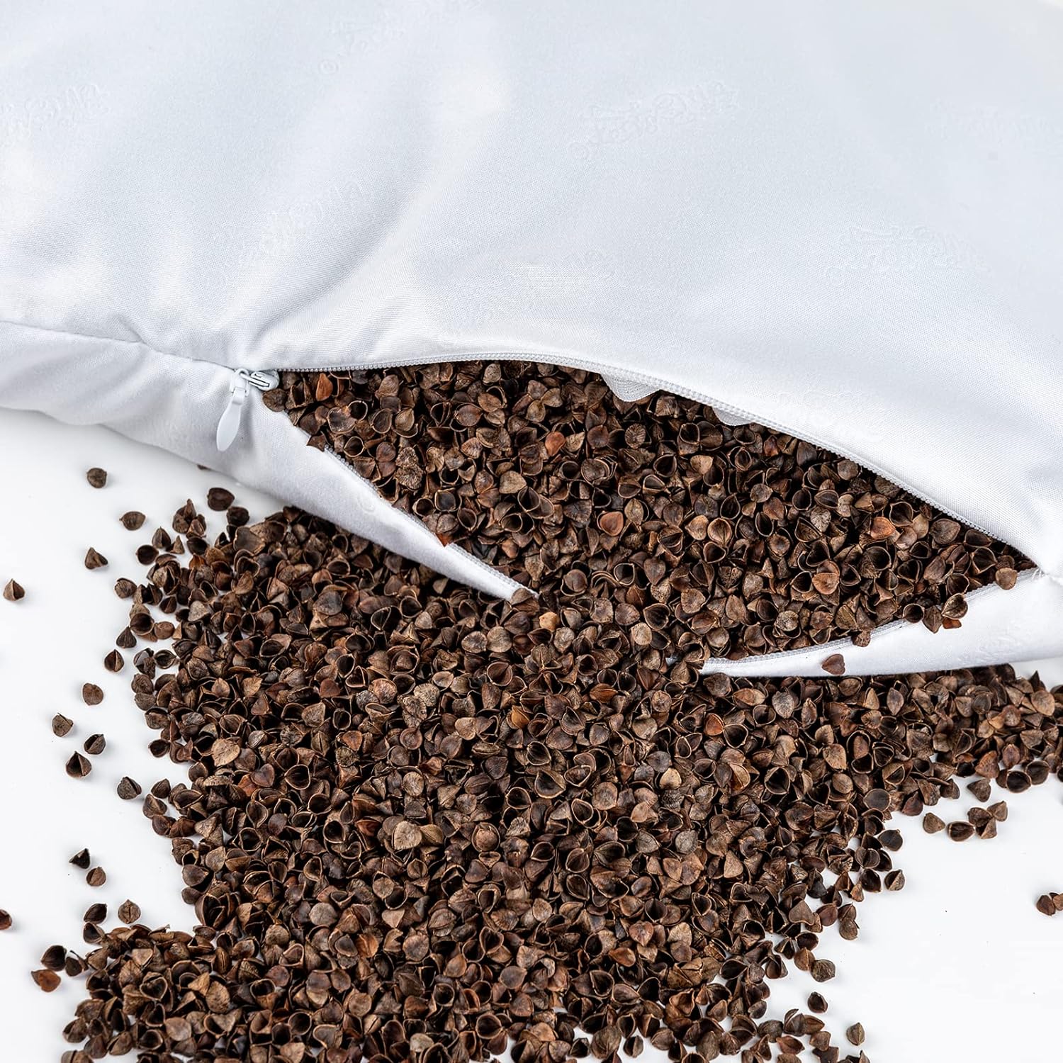 - QUALITY MATERIAL: Premium buckwheat hulls,clean and plump,warm in winter and cool in summer,offer the firm and comfy supporting to the neck curve.That can help to relieve neck pain and improve sleep.The pillow cover is made of high quality heavy weight soft fabric, which will exhibit textured and natural soft touch, not only thick and durable but also breathable and cozy.