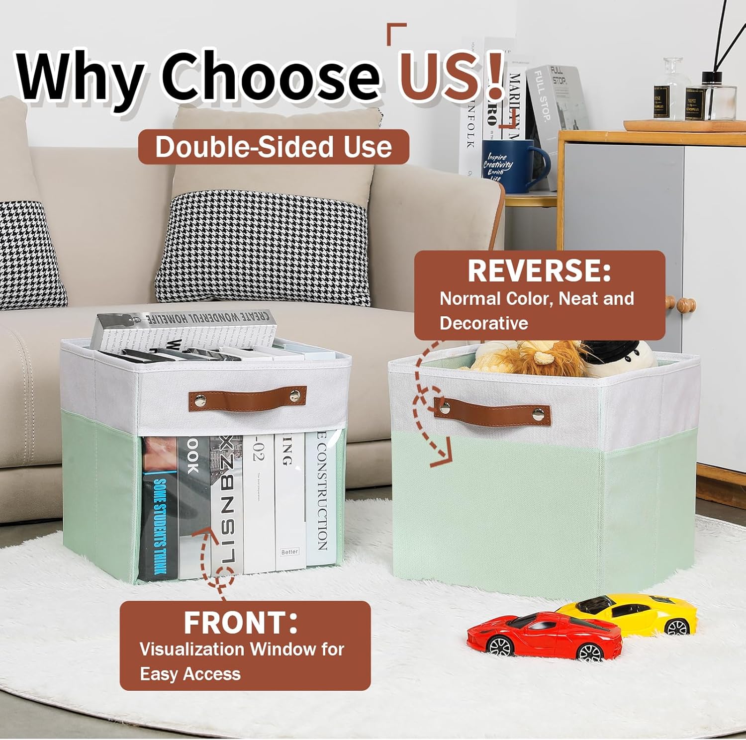 HNZIGE Clear Storage Cubes Bins 11 x 11, Fabric Storage Cube Bins for Storage Organizer,Shelf Storage Bin for Organizing, Cubby Foldable Cube Organizer Bin for Storage Blanket Home(White Green 6PCS)