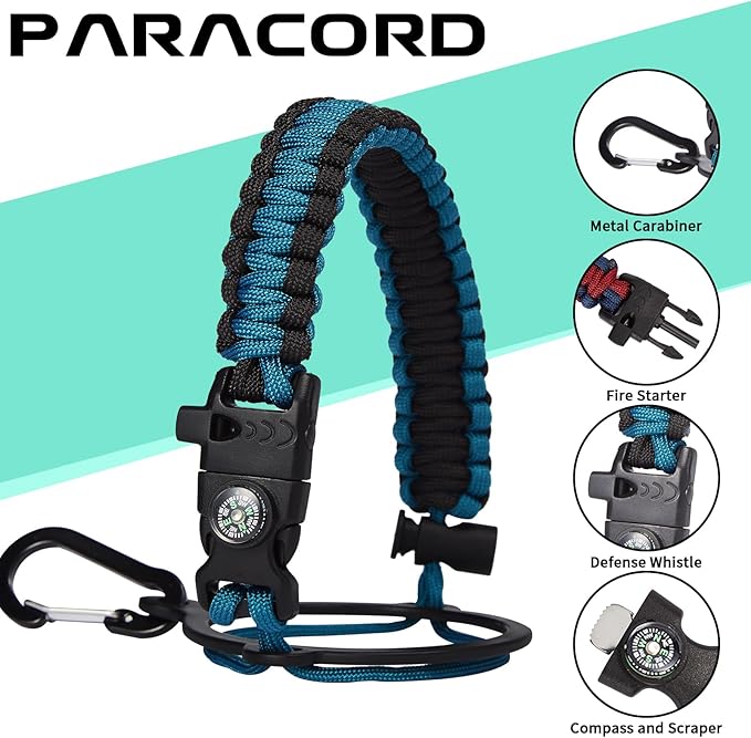 - UNIQUE DESIGNS PARACORD HANDLE: Full-function paracord handle made in individual styles to match the color of the flask water bottles. With compass, safety ring, carabiner & whistle. It unravels into a sturdy and taut rope in an emergency, making the large water jug an ideal survival kit for expeditions in the wild