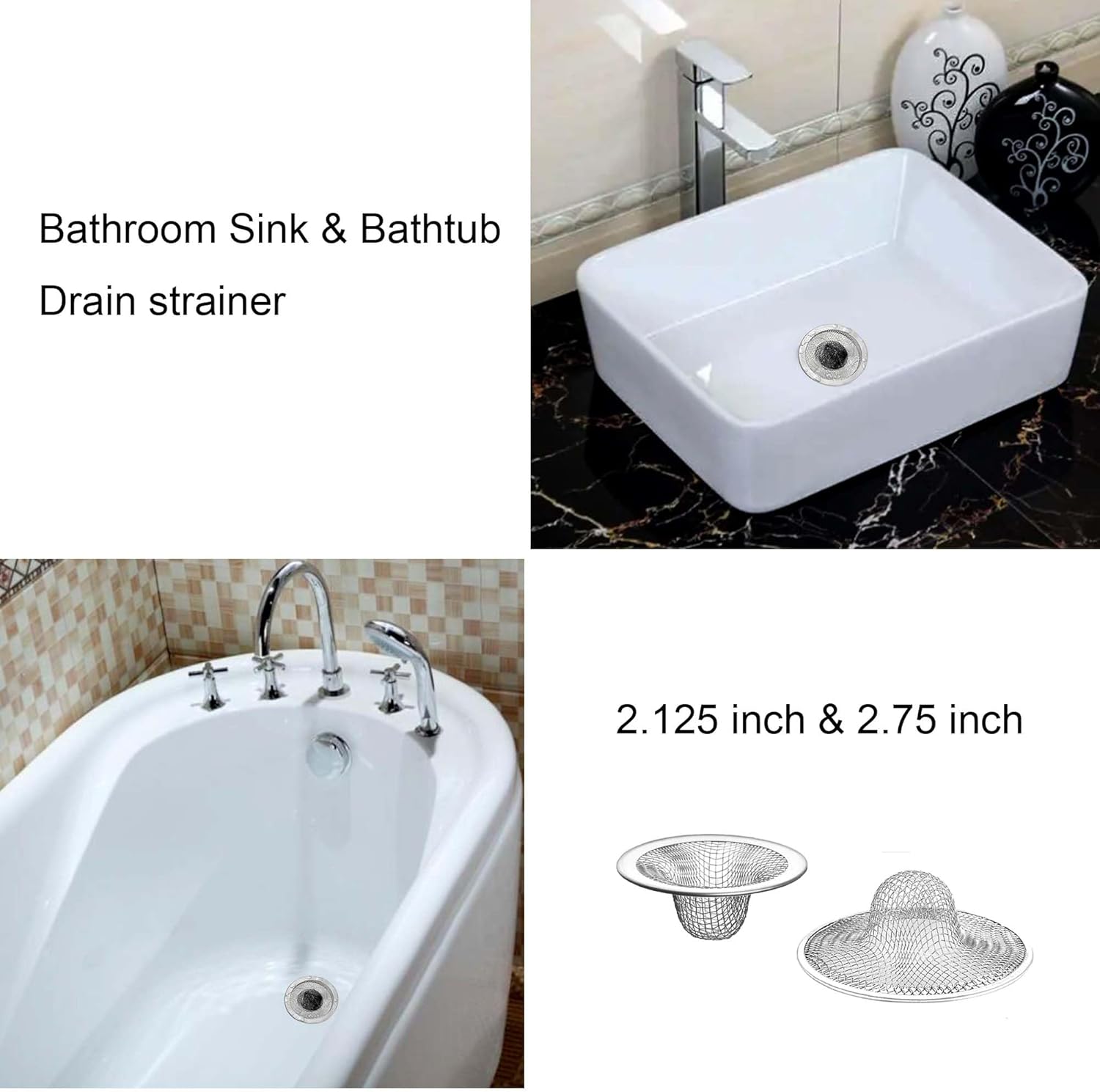 - Set of 25 Metal Mesh Sink Drain Strainers: Bathroom sink and tub mesh drain strainer, bathroom sink metal strainer, you will receive 25 pcs metal mesh sink strainers, shower mesh drain covers, whose top diameters are 2.75''(15 pcs) and 2.125'' (10 pcs), making them a perfect fit for most bathroom sinks and bathtubs to effectively captures hair and preventing small items from accidentally going down the drain (rings, earrings etc).