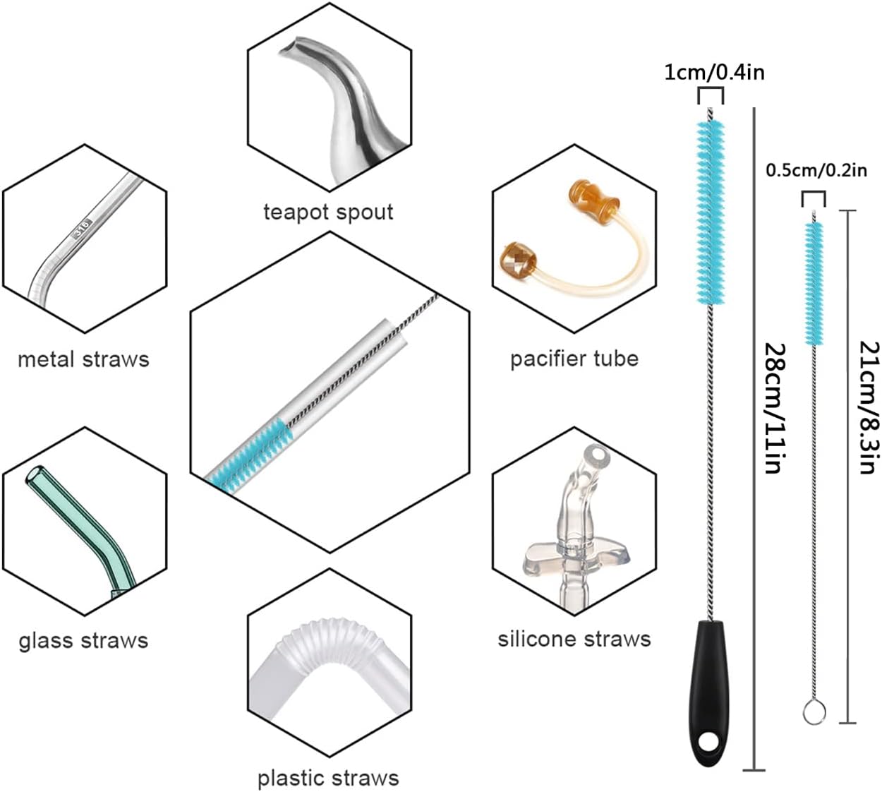 - The stainless steel long-handled water bottle brush features a removable design and one brush head that measures approximately 2 1/2 inches in diameter. The top of the brush handle has a keyhole-like slot into which the brush head can be inserted by sliding the bottom of the brush head into the slot and twisting the brush head to the left to lock it in place. The large straw brush is 10.8 inches/27.5 cm long for easy cleaning of sports water bottle thermos straws, and the small straw brush is 8 inches/20.5 cm long for cleaning and unclogging the microscopic holes in baby bottle straws to keep them clean, hygienic and environmentally friendly.