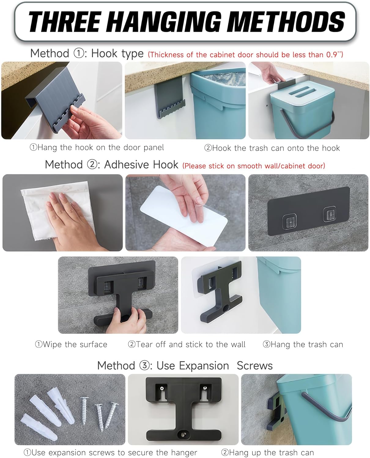 - ✅[Under Sink / Wall Mount Trash Can] Hanging trash is an excellent choice for your daily activities. You can use it while you cook and then store it under the sink. Fit for most cabinet doors, pantry doors, cupboards, under sinks, walls, and countertops.