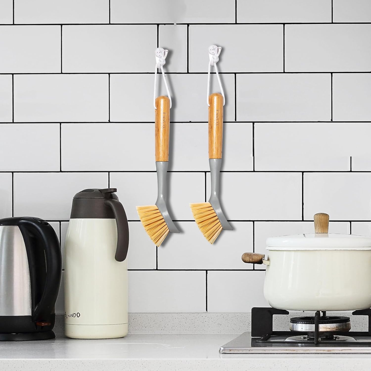 - [Eco-Friendly] This kitchen brush built with sturdy eco-friendly and comfortable natural bamboo handle, non-scratch and odorless bristles. The Kitchen brush with scraper scrub brush head, can easily removes stuck-on food, and dish scrubber’s handle has hanging loop for hanging to drying & storage.