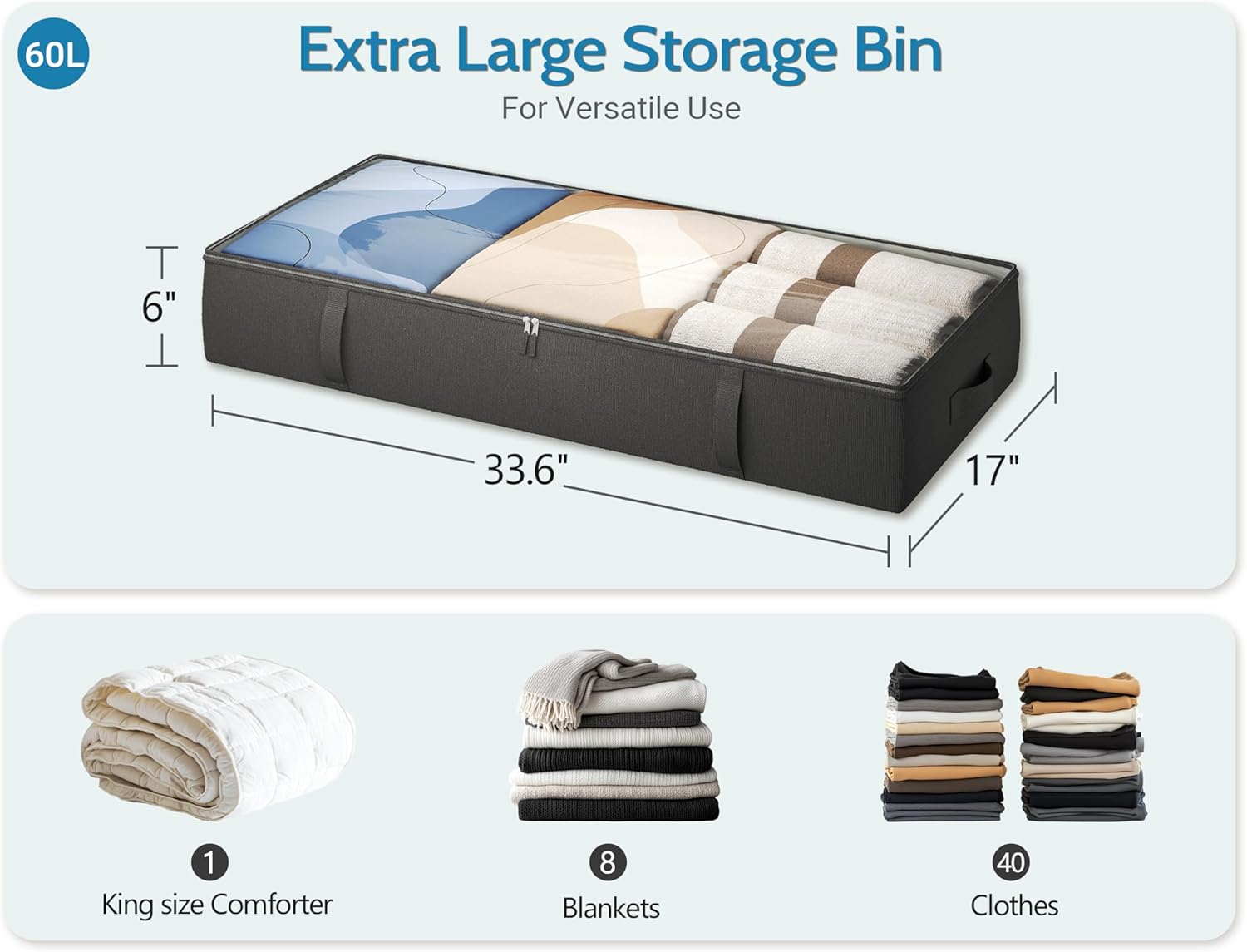 - 60L Large Capacity Storage Bin - This underbed storage has a capacity of 60 liters, 33.7"L x 17.1"W x 6"H, so you'll have enough space to store your favorite clothes, sheets, blankets, toys, CDs, books, and more. You won't be disappointed about this under bed storage container!