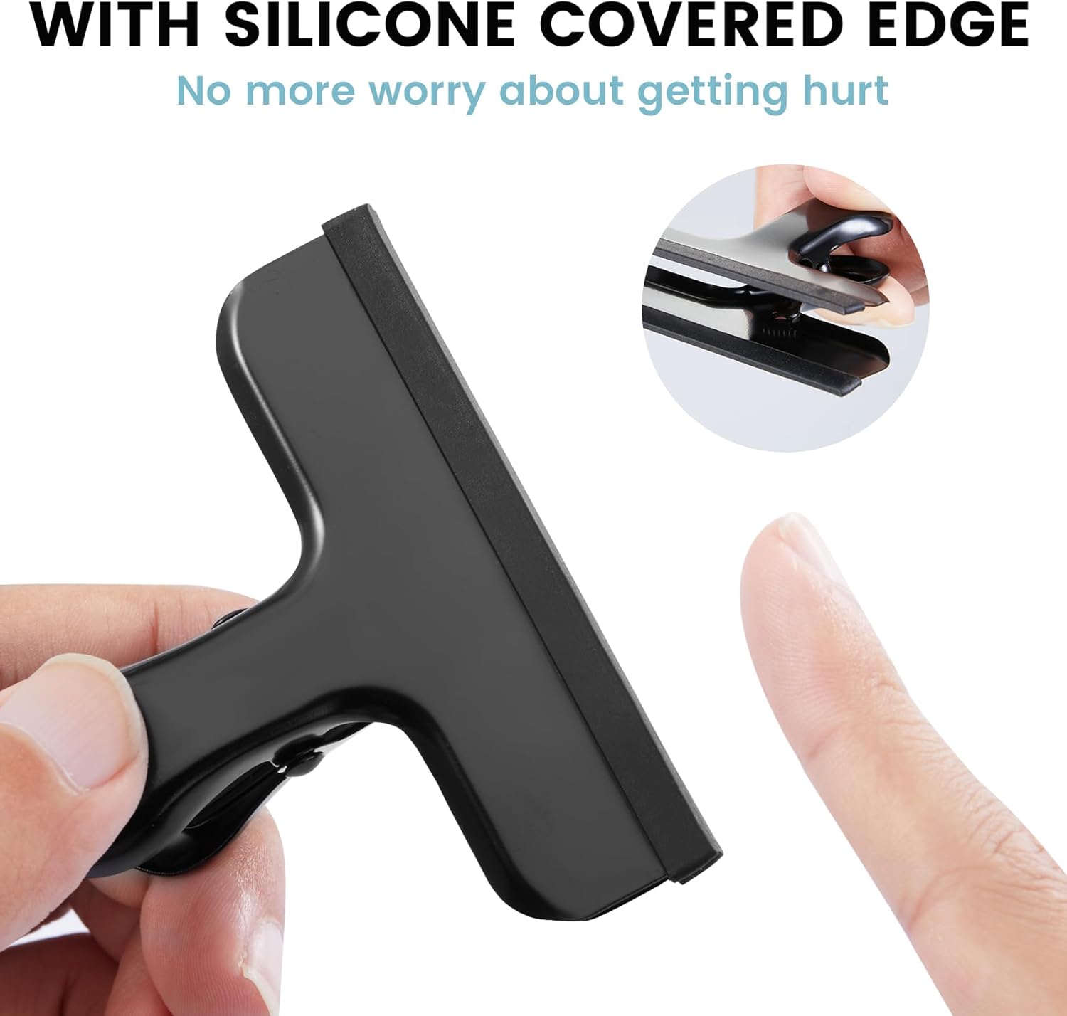 HOUSE AGAIN 8 Pack Stainless Steel Chip Bag Clips Covered with Silicone - NO More Sharp Edges - Color Coded for Food Bags - Air Tight Seal, Heavy Duty for Kitchen and Office, 3 Inches Wide, Black