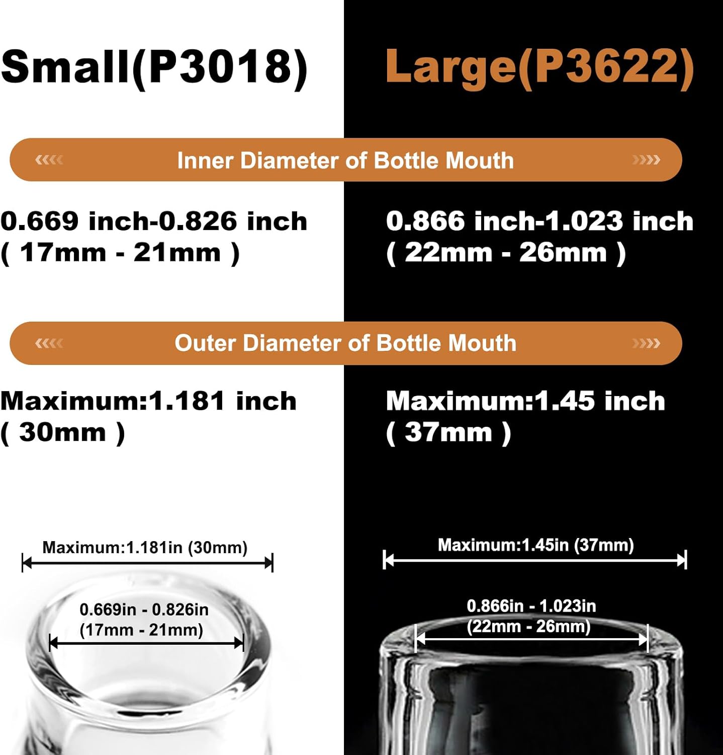 - Fits Most Bottles: Two models, covering 90% of common glass bottle mouths, fit up to Inner 0.669 inch-0.826 inch (17 mm-21 mm )and outer diameter maximum 1.181 inch (30 mm) bottle necks