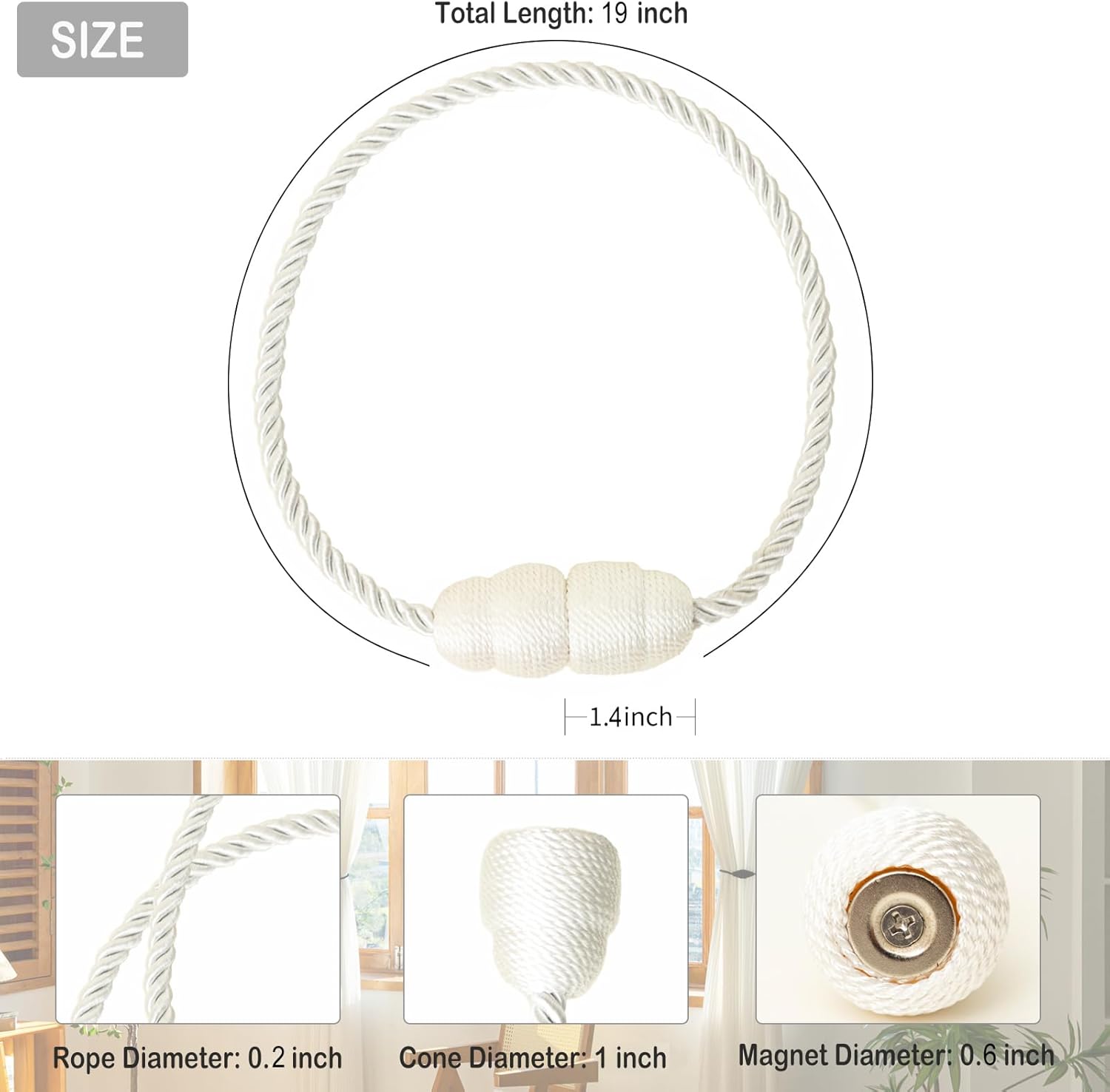 - Adjust Length Freely- Total Length - 19", Rope Diameter- 0.2". Ball Diameter- 1". You can wind it twice or use it directly. By tightening or relaxing the curtain tiebacks, the folding and drooping degree of the curtains can be adjusted to achieve a personalized curtain display effect. increase the chance of window ventilation.