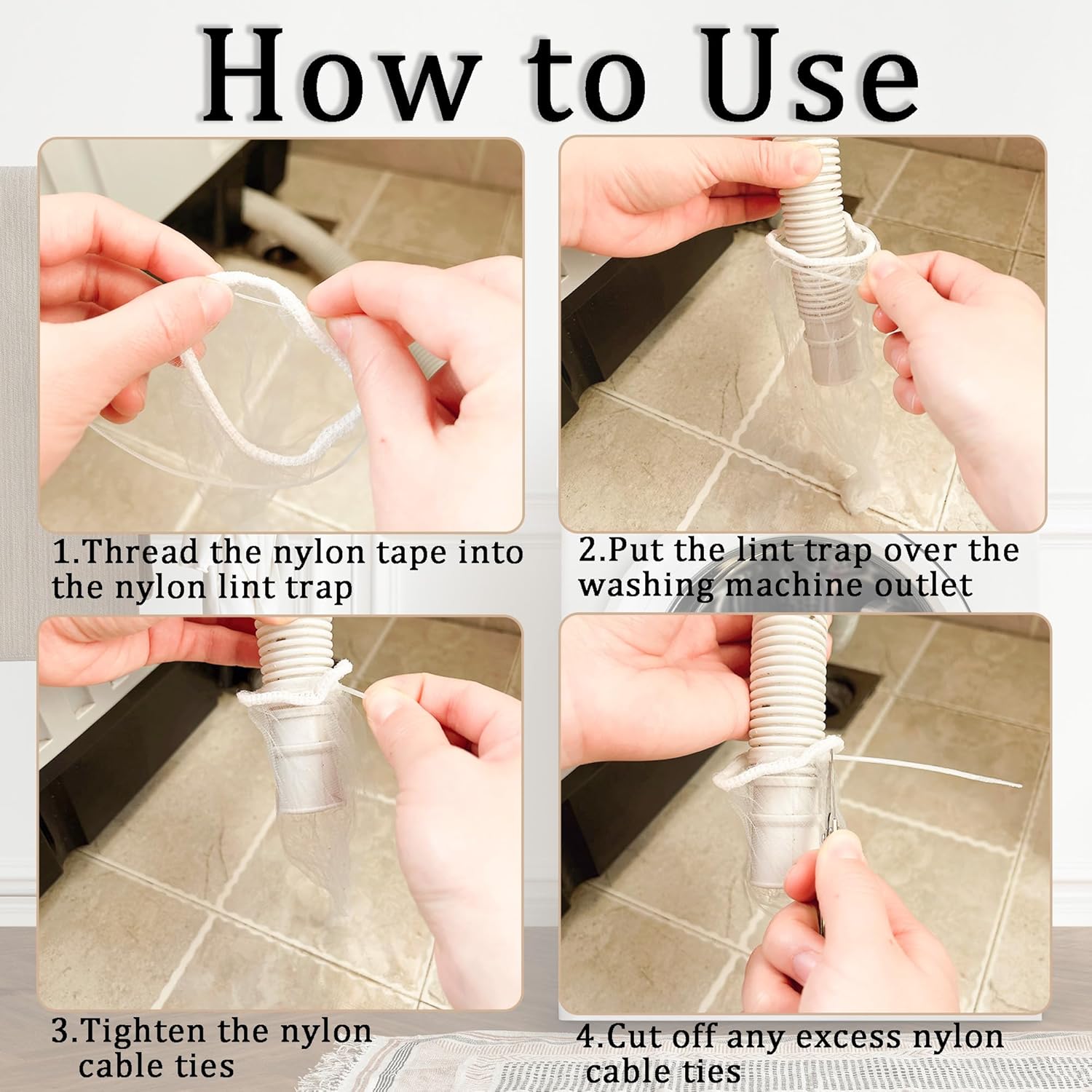 - Reliable Quality: Our nylon washing machine lint traps are made of durable nylon fabric with densely woven mesh that effectively captures hair and lint, preventing clogs in the drain pipe. The nylon ties are strong and secure, ensuring they stay in place.
