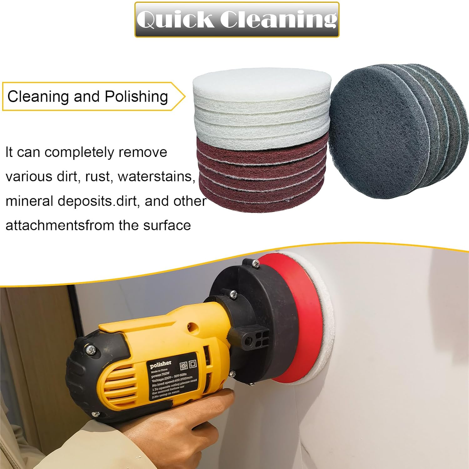 - Efficient Cleaning & Polishing: Use these pads alongside the hook and loop backing pad for speedy, effective cleaning and deburring. They efficiently remove dirt, rust, water spots, mineral deposits, and grime, leaving the material surface spotless.