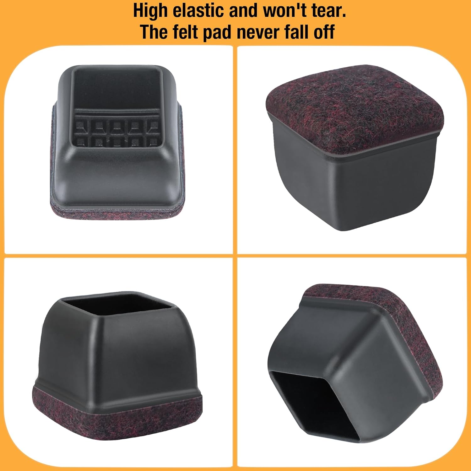 - 【Upgrade New Design】: 360° full felt pad bottom wrapped, which helps the felt bottom be able to touch the floor at any angle, preventing scratching the floor. Our chair leg floor protectors do not use gel. The bottom felt pad and the silicone chair leg floor protectors are integrated with a high-pressure machine to ensure that they will never fall off.