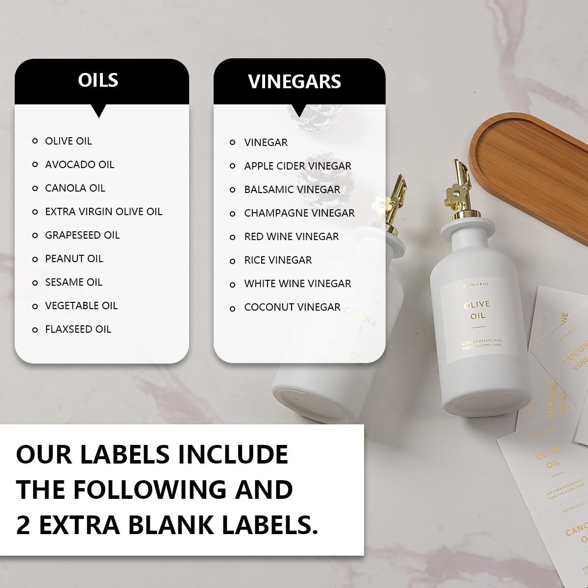 - 12oz KITCHEN OLIVE OIL DISPENSER BOTTLES – The oil and vinegar dispenser set contains 2 white 11.8oz (350ML) glass bottles, 2 gold stainless steel oil spouts, 17 waterproof labels(kinds of oil and vinegar) and a bamboo tray, Ideal for safely store and dispense your olive oil and vinegar.