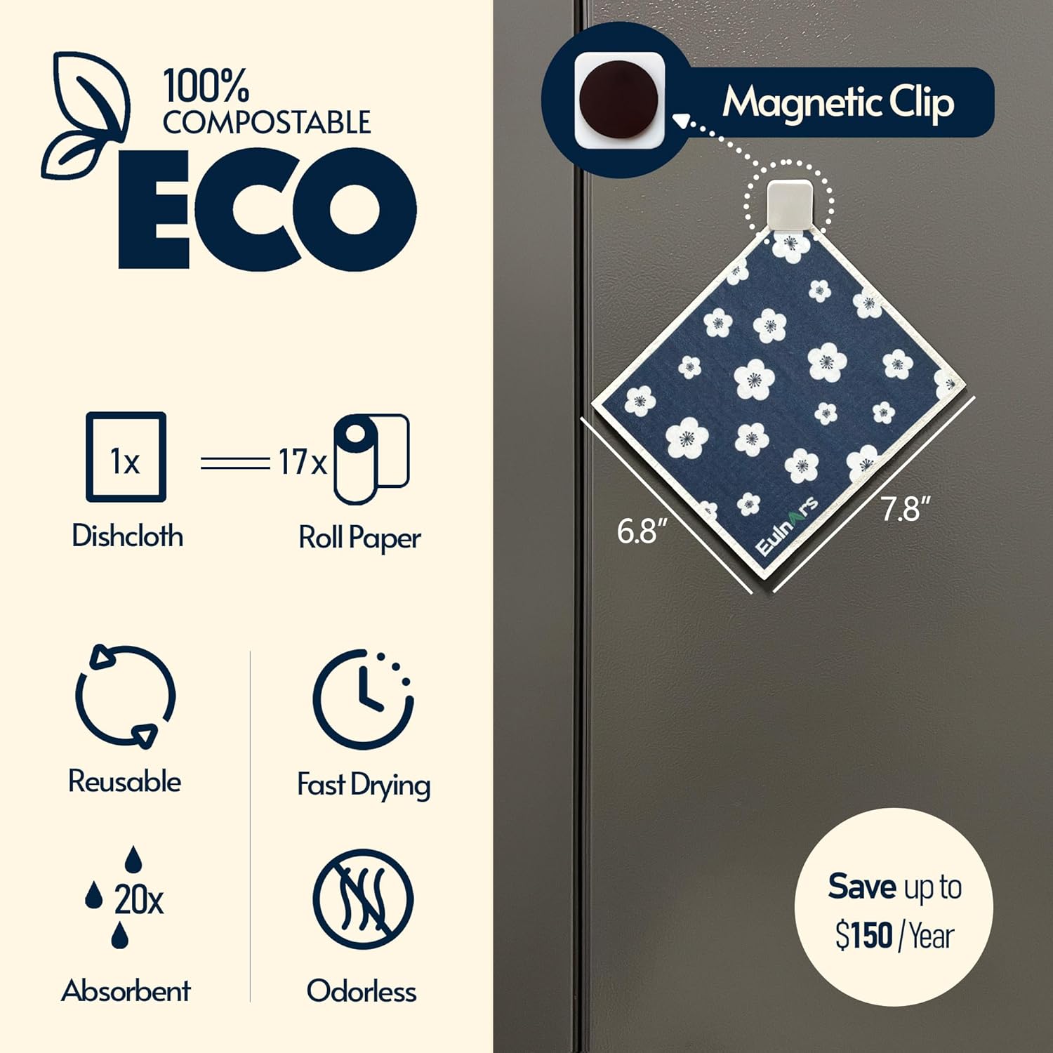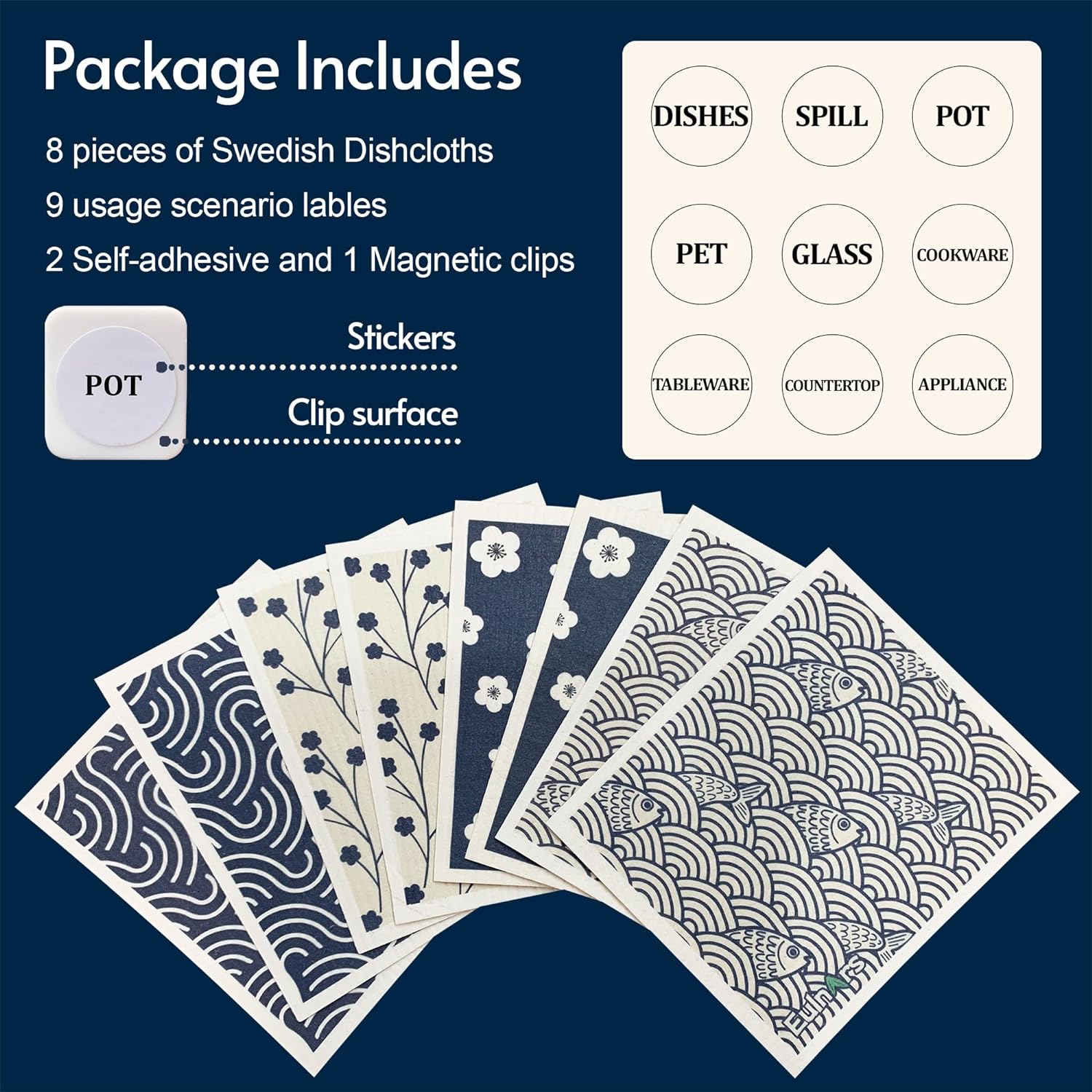 - Easy to Clean and Store: Our swedish dish cloths, measuring 7.8 x 6.8 inches, each set comes with 8 dish cloths in 4 styles, along with 2 self-adhesive clips, 1 magnetic clip, and 9 labeling tags. Customize storage for easy access, hanging them on walls, counters, or refrigerators to keep your kitchen organized