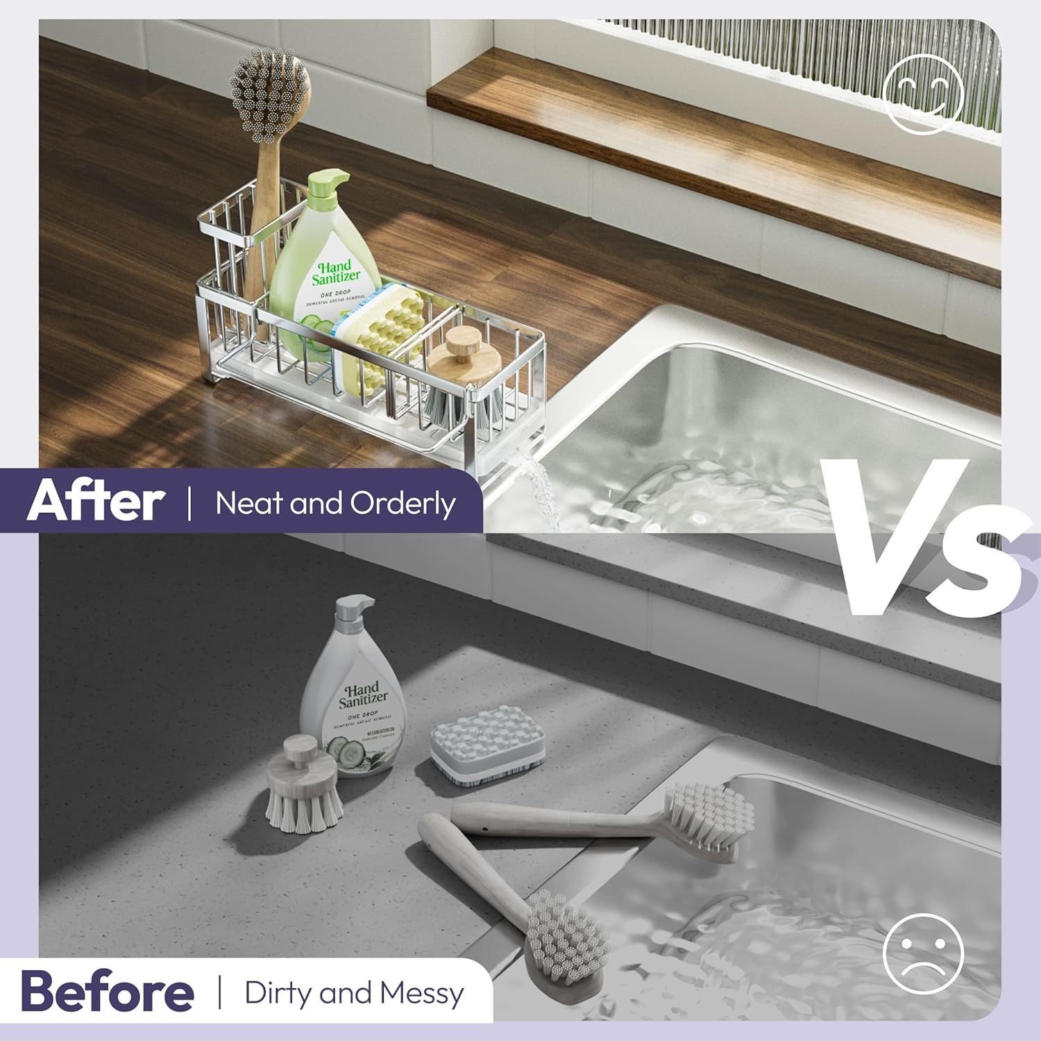 - [Unique Divided Space Sponge Caddy]: The removable baffle design divides the sink caddy into 2 separate storage spaces, you can disassemble at any time according to your need, it's perfect for storing dish soap bottles, sponges, sink stoppers,etc