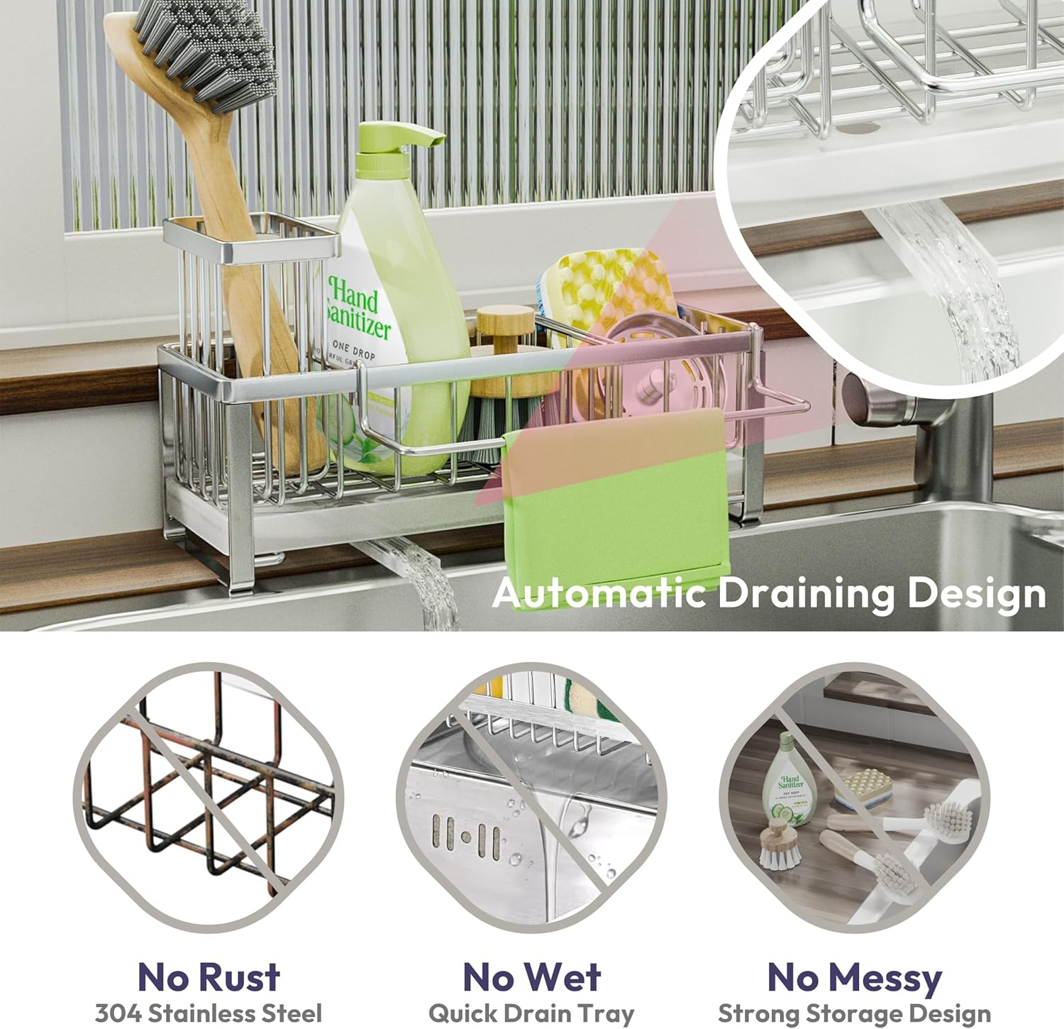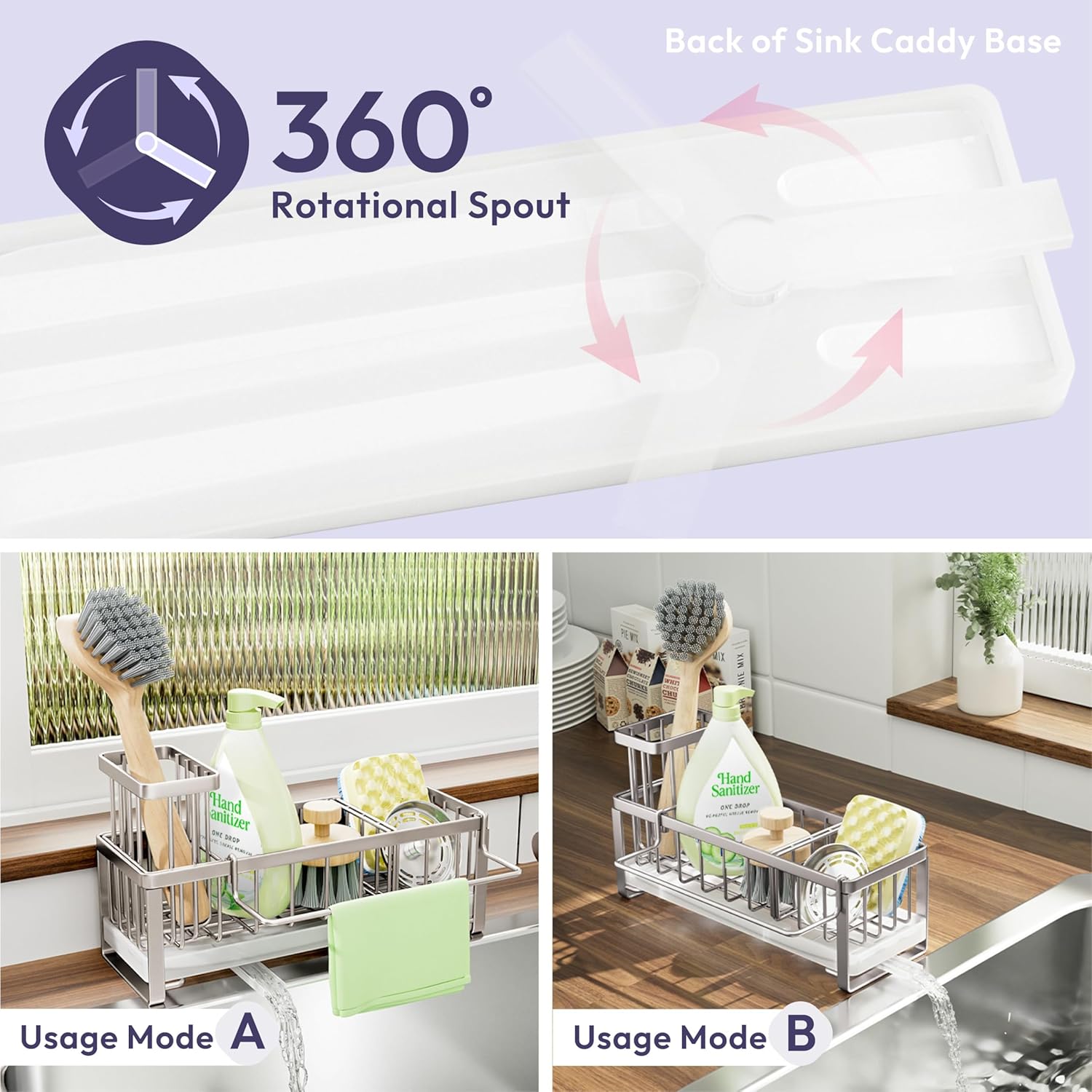 - [Automatic Draining]: Are you tired of cleaning the countertop?SWTYMIKI sponge holder for kitchen sink with 360° rotatable draining pipe can help you! Just put the sink caddy next to the sink, the water will drain automatically into the sink