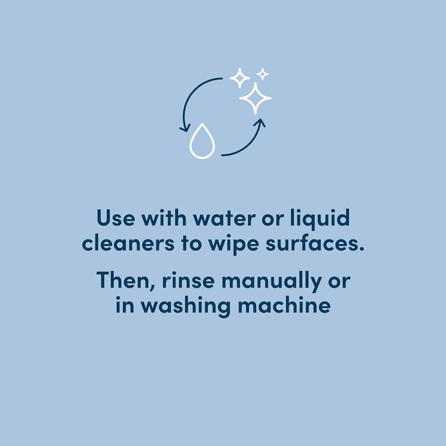 - Use with water or liquid cleaners to wipe surfaces. Rinse manually or in washing machine