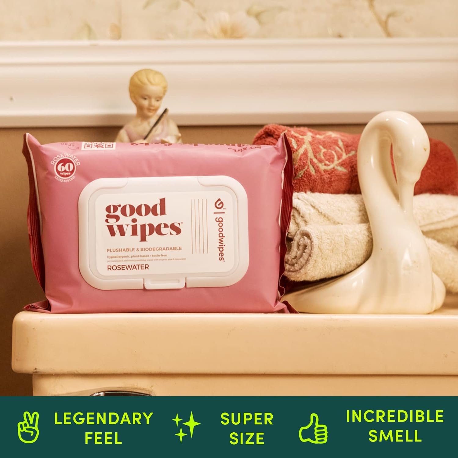 Goodwipes Flushable Wipes – Made with Vitamin E & Aloe – Soft, Individually Wrapped Butt & Feminine Cloths for On-the-Go & Travel Use – Largest Adult Toilet Towelettes – Rosewater, 1 pack, 32 count