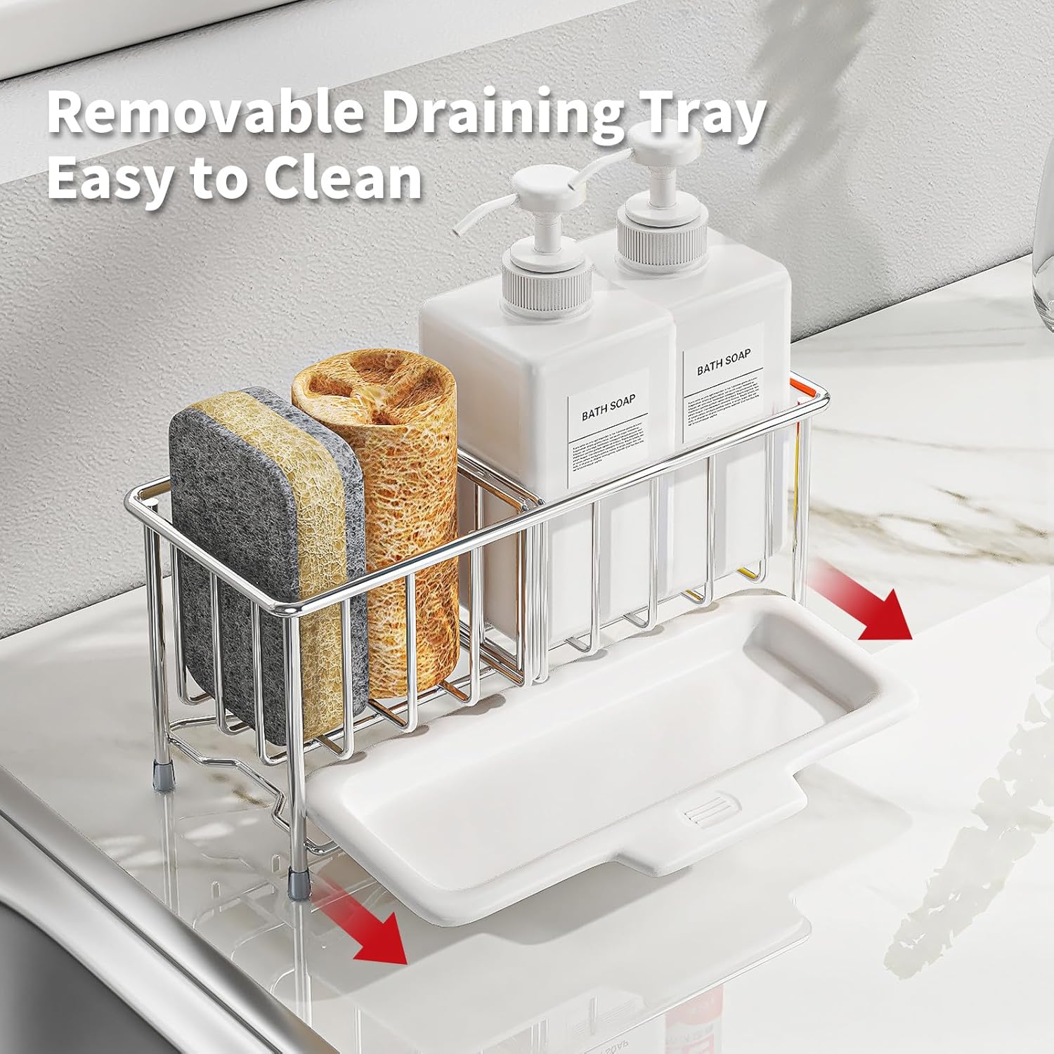 - 【Dry and Ventilated】 This kitchen sink sponge holder features a split-sink design with a removable tray, which can effectively drain the moisture from kitchen cleaning tools and make them dry faster. The discharged moisture falls on the tray for easy pouring and cleaning, which can always keep the desktop clean and tidy, and keep it dry and ventilated