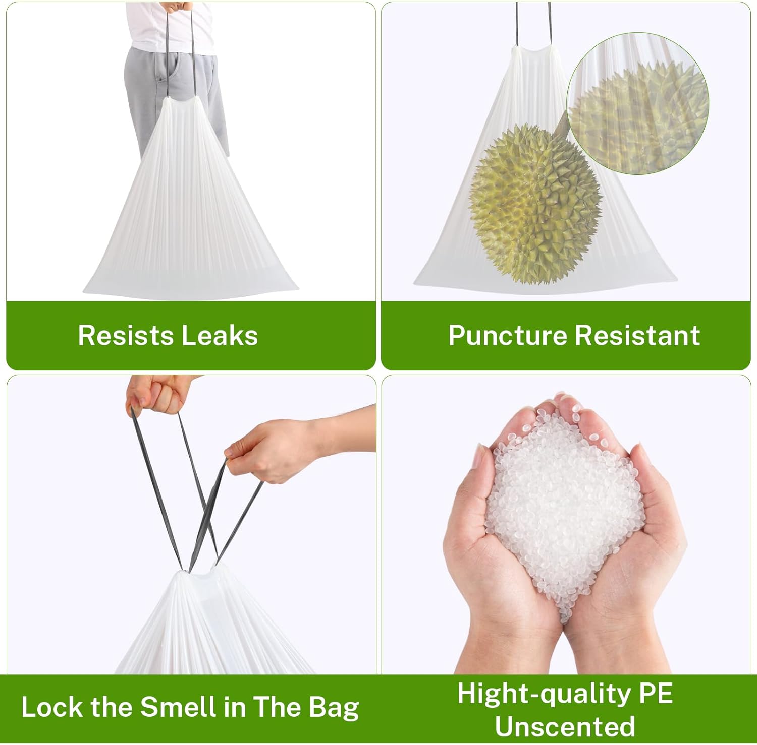 - Convenient Drawstring: for hassle-free trash removal, the medium size garbage bags are designed with durable drawstring handle(1 inch wide, comfortable feel). With a quick cinch, the drawstring 15 gallon trash bags are easy to lift, tie, and throw away.