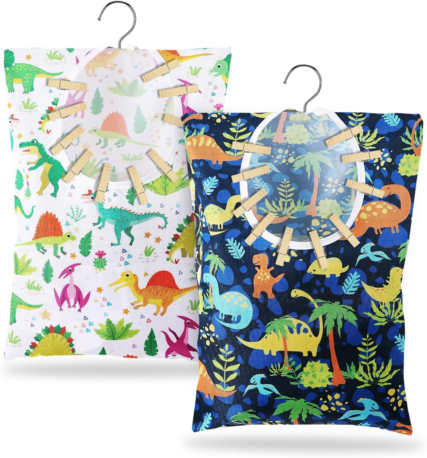 - Dinosaurs Theme: package includes 2 pieces of clothes pins bag holder in dinosaurs designs, full of cartoon feeling, can add charm to your home; Proper quantity can satisfy your different daily use and replacement needs