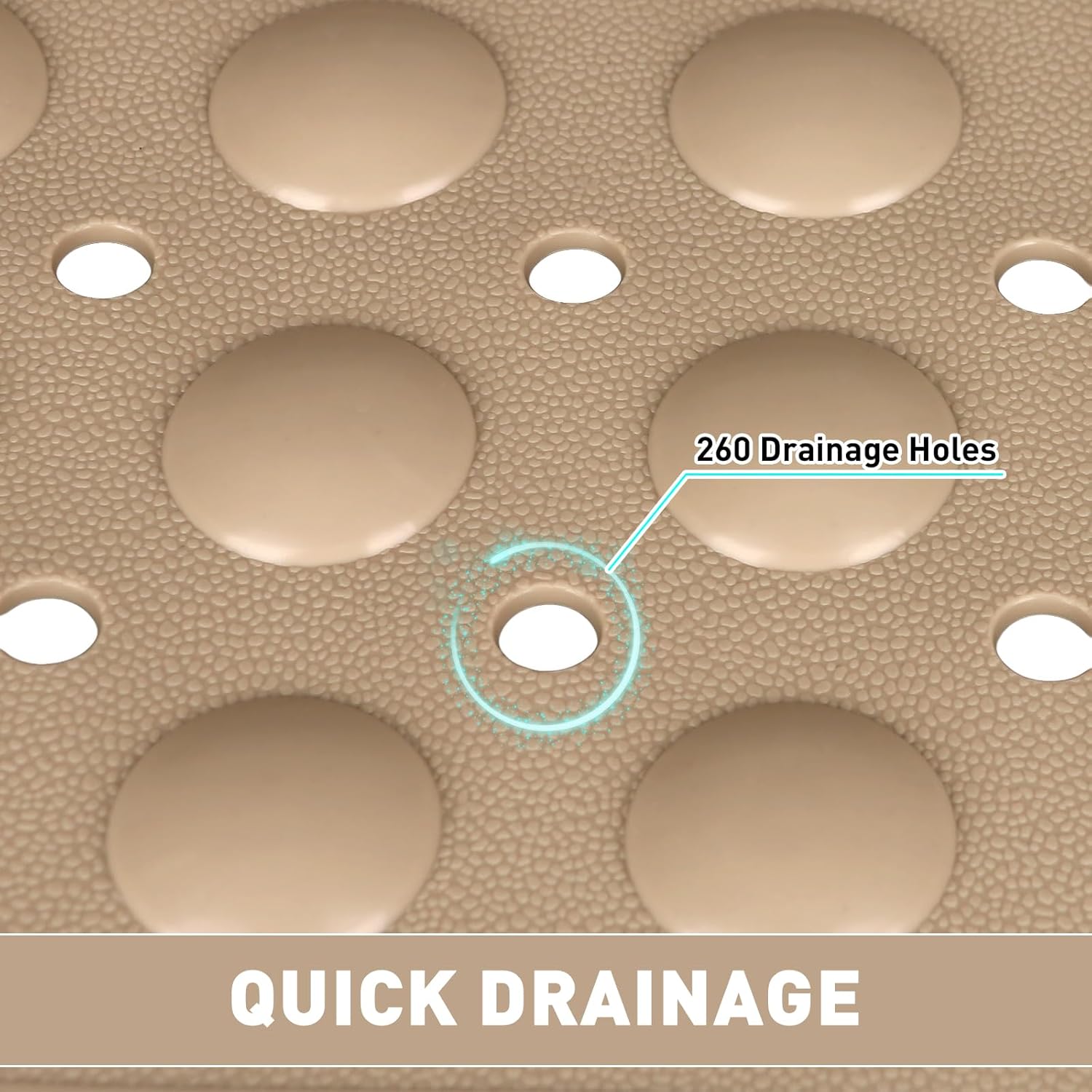 - QUICK DRAINAGE: Our oversized shower mat has 260 drainage holes, so water can freely flow through the shower mat during the shower, which can quickly and effectively discharge excess water and soap, avoid water accumulation in the shower room and reduce the risk of falling