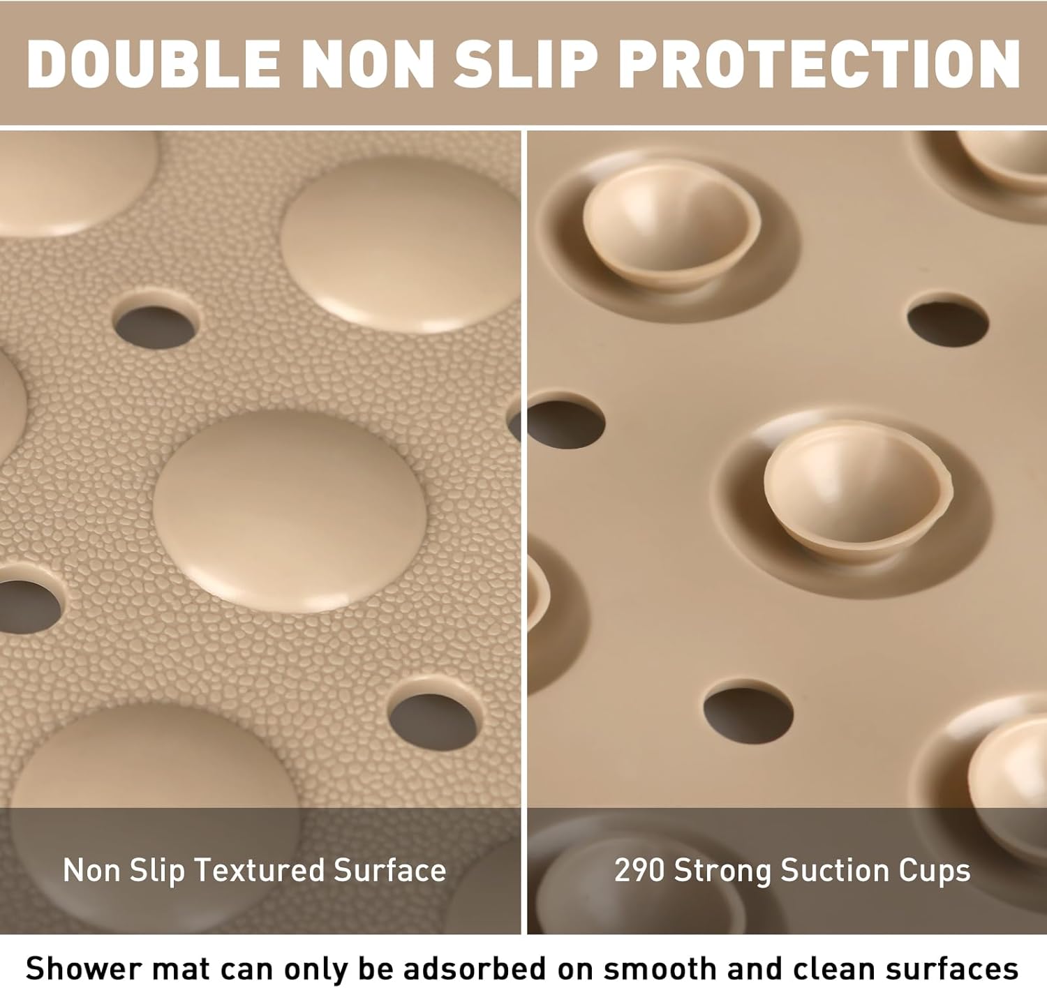 - SUPER NON SLIP: Our shower mat has a delicate anti-slip texture on the surface and 290 suction cups on the back, which can be firmly adsorbed on the floor. Note: To prevent slipping, do not use shower oils. Shower mats can only be adsorbed on smooth and clean surfaces