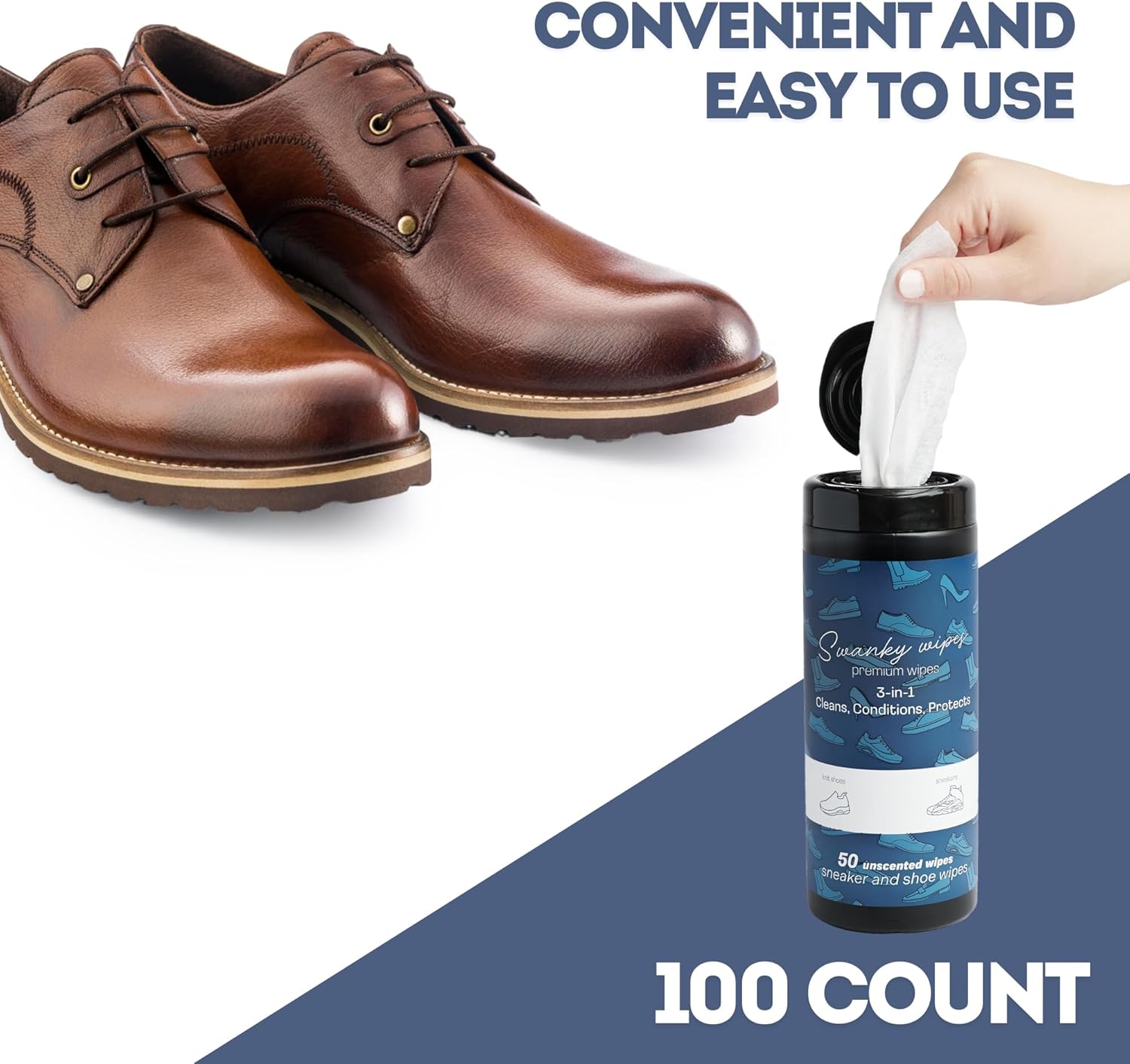 - PRODUCT SPECS - Each pack of Swanky Shoe Cleaner Wipes contains 100 soft wipes, ensuring long-lasting use. These wipes are designed to be gentle yet thorough, suitable for use on leather, sneakers, and various other shoe materials. Compact and portable, they are ideal for home or travel.