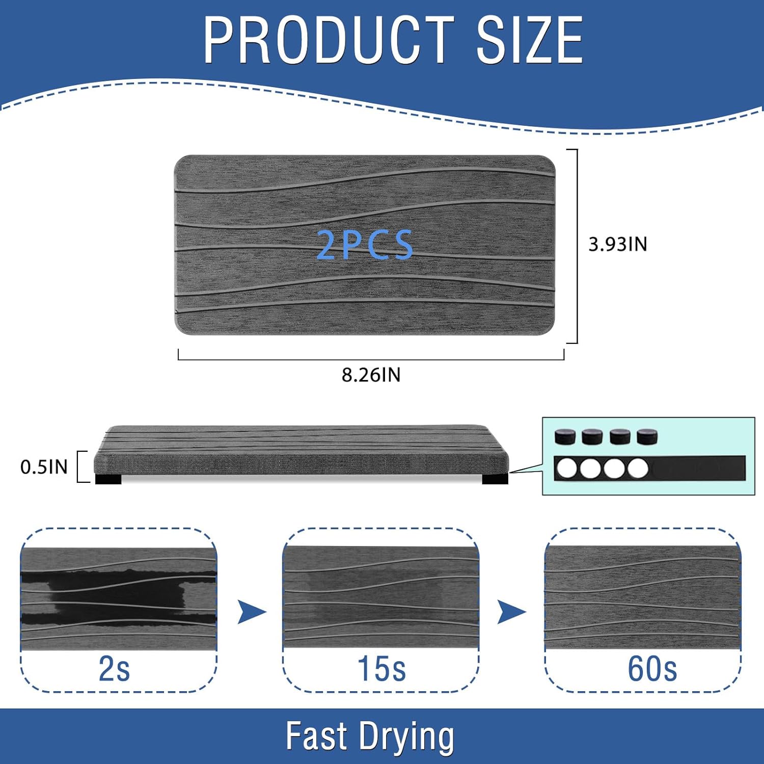 - Perfect Size & 2-pieces --- Our fast drying stone sink tray are thicker and larger than other products. Packaging Includes: 2 pieces pads of 8.27 inches * 3.94 inches * 0.5 inches (21 cm * 10 cm * 1.25 cm); Silicone non-slip pad * 32; 2 pieces of sandpaper. They can meet your daily needs.