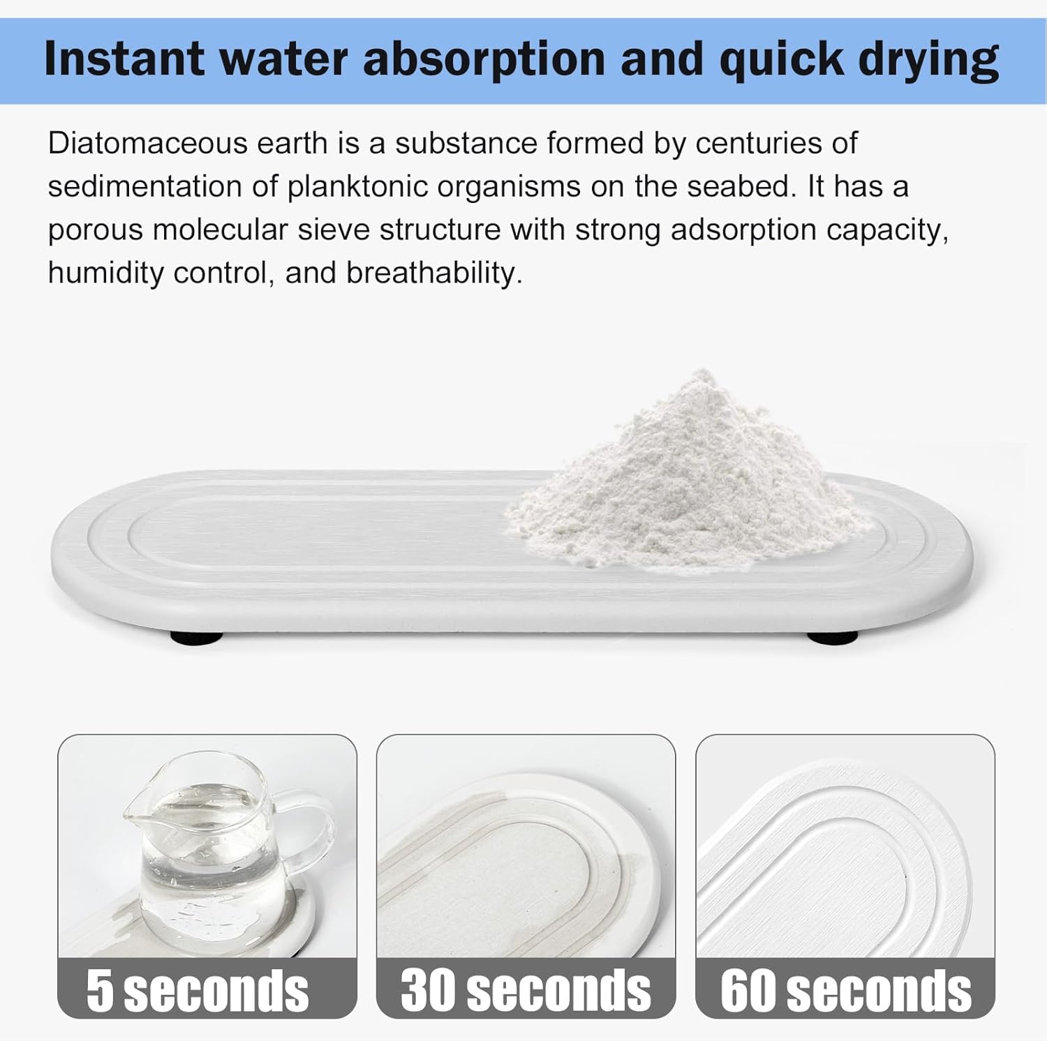 - Quick Water Absorption and Fast Drying --- Our stone soap tray is made from natural diatom mud and plant fibers,the small pores in diatomaceous earth give it amazing water absorption.They can absorb water and dry out in a few minutes.This fast drying stone sink tray makes the bathroom countertop more dry and tidy.