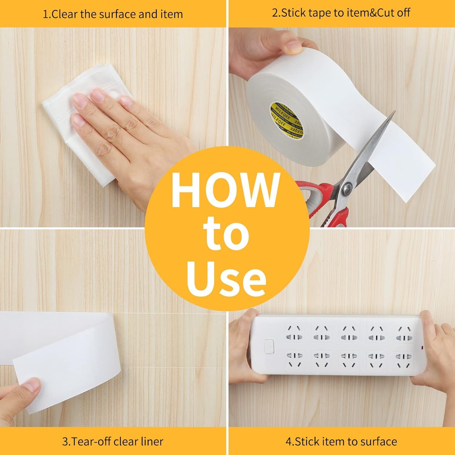 - EASY TEAR TAPE,EASY TO USE- Easy tape double sided is tearable by hand and easy removable.Before applying 2 sided tape heavy duty, make sure surface is clean and dry,then rip or cut double sided tape strips into desired length, then apply thin double sided adhesive tape onto the surface,peel off yellow paper backing(release liner),put items to double tape resistant and press firmly.