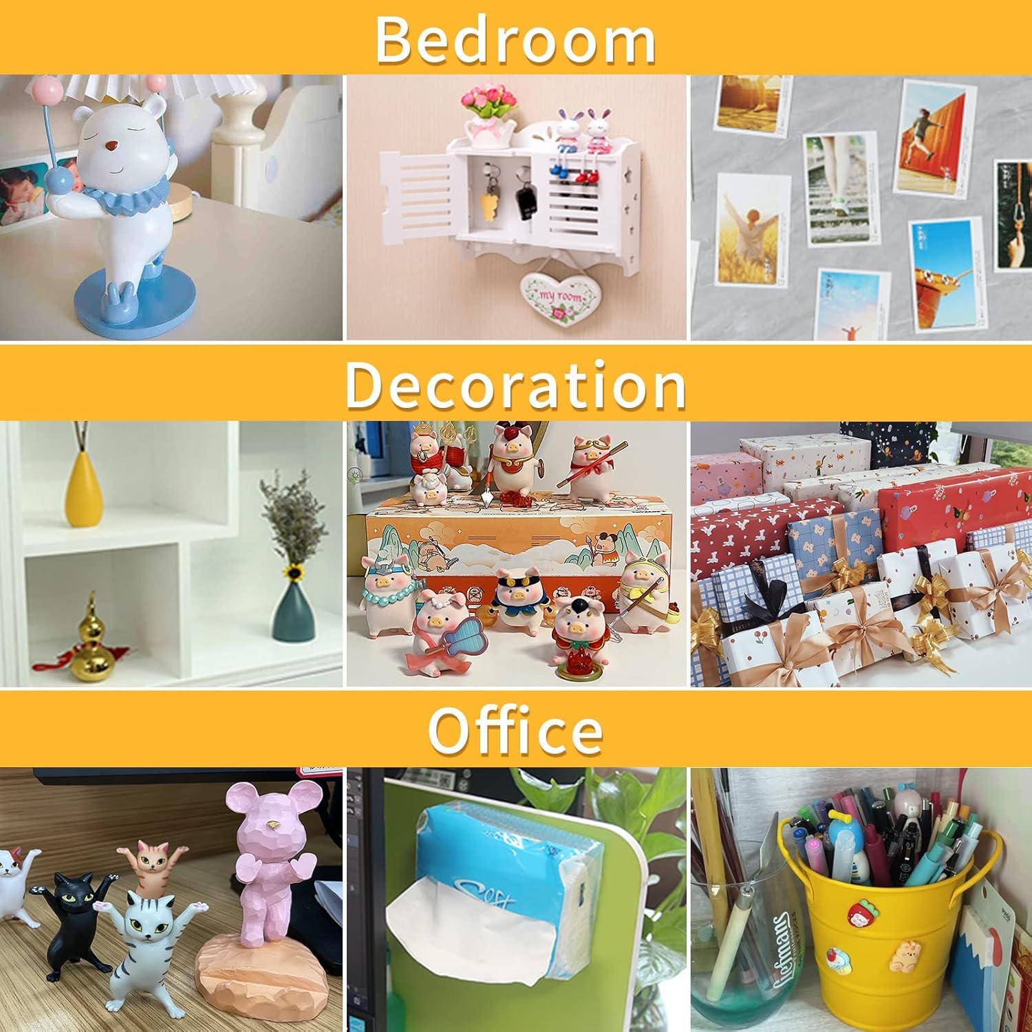 - MULTIPURPOSE DOUBLE SIDED TAPE- Two sided tape heavy duty is applicable to home accessories like carpets, area rugs, runners, fridge, photo frames, nameplates, sofa cushions, doormats, car mats, poster, DIY projects and so much more. Double stick tape is suitable for various surfaces like hardwood, tile,glass, plastic, concrete etc.