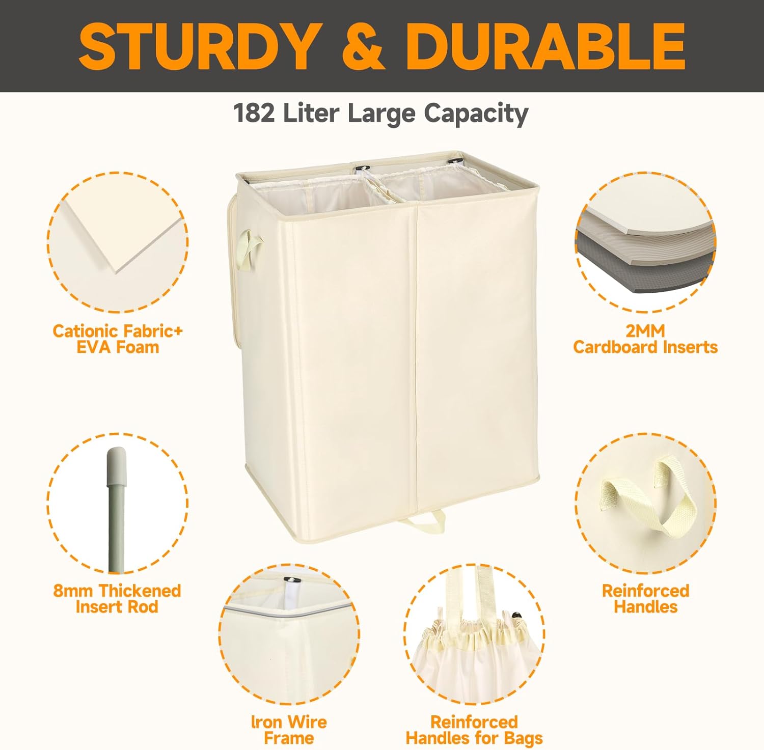 - 【Durable Fabric】The dual laundry bin is made of 300D cationic cloth and 1.2mm thickened EVA composite material.Cationic cloth added polymer materials, effectively enhance the overall strength of the fabric, compared to ordinary Oxford cloth not only greatly improve the service life, but also has a waterproof, abrasion-resistant, tear-resistant, moisture-absorbent, breathable and other characteristics. At the same time the composite layer of EVA foam more enhanced these advantages