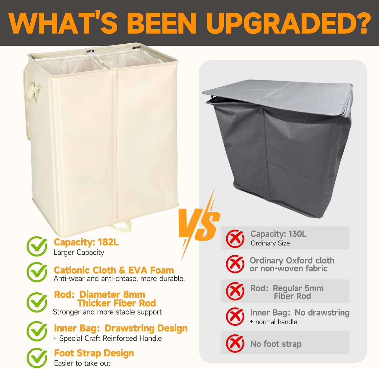 - 【Size Upgrade】The double compartment clothes basket measures 23.62x 15.75 x 30in with a huge capacity of 182L, which can hold 6 loads of laundry, and each compartment is 91L which can hold 2.5-3 loads of laundry individually
