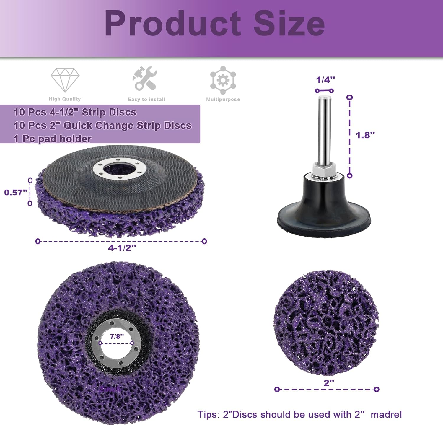 - ใ๐ฃ๐ฎ๐ฐ๐ธ๐ฎ๐ด๐ฒ ๐๐ป๐ฐ๐น๐๐ฑ๐ฒ๐ใ10 pcs 4-1/2'' x 7/8'' & 10 pcs 2" Strip Discs Rust Remover Wheel, and 1 pc quick change disc pad holder. Total 21 pack strip discs rust remover wheel kit, and it comes in two sizes to meet your different rust removal needs.