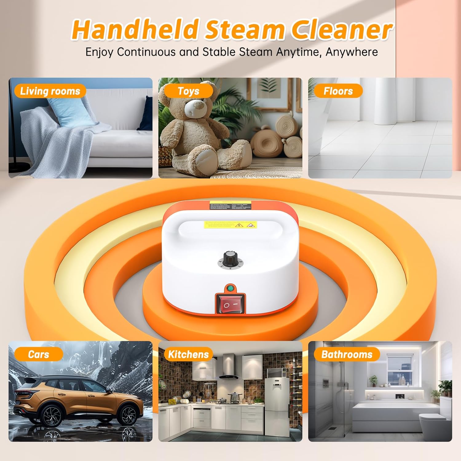 - 【Small and Portable, Easy to Store】 The handheld steam cleaner uses a thickened high-quality ABS shell to reduce the weight of holding, And the 4.9*7.9*6.5-inch compact design makes it easy to store and carry, And it does not take up too much space. You will get: Handheld steam cleaner, Extension rod, Large round brush, Small brush, Steel brush, Short copper nozzle, Power cord, 2 silicone black washers, 65-inch steam hose, 43-inch transparent hose, User manual.