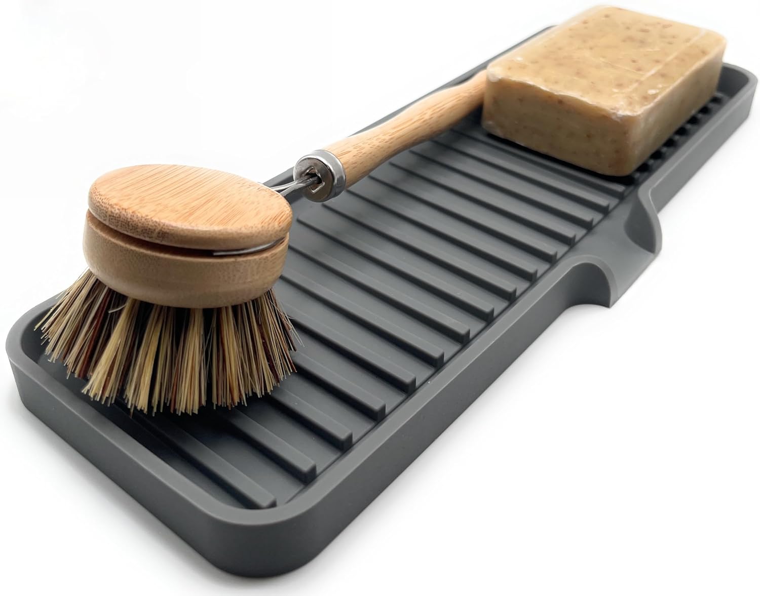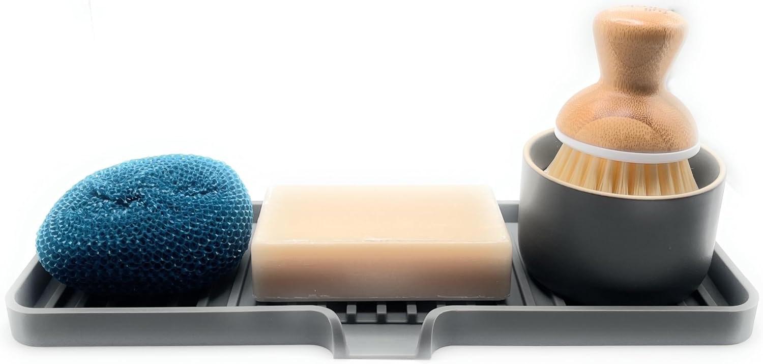 Happitasa Silicone Soap Dish Tray and Sponge Holder with Drain Chute | Bathroom and Kitchen Sink Organizer Caddy (Grey, 12"x4", 7.4 Ounces)