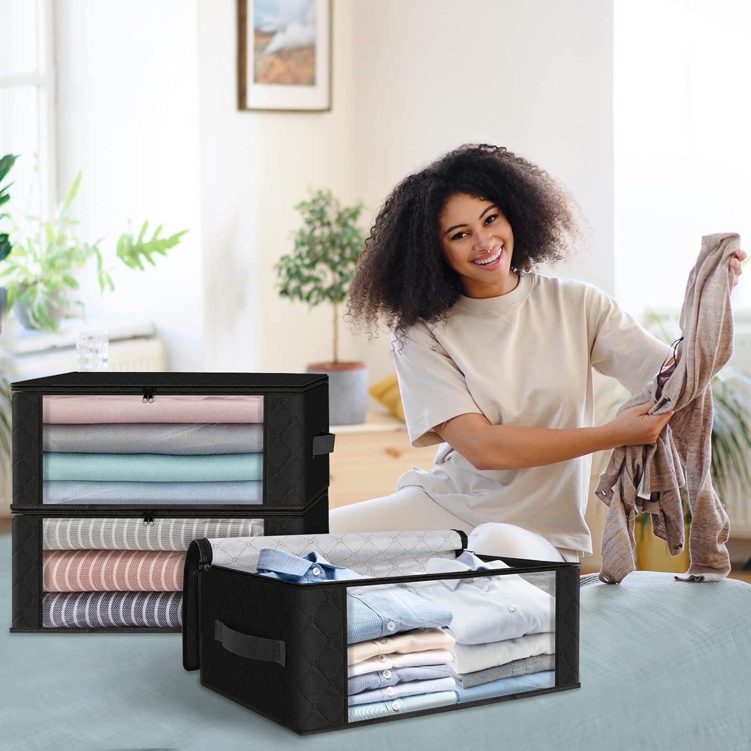HomeHacks Storage 10-Pack Clothes Organizer Storage Bags Foldable Storage Box with Large Clear Window Sturdy Handles for Closet, Dorm, Pillows, Bedding, Clothes, Blankets, 35L, Black