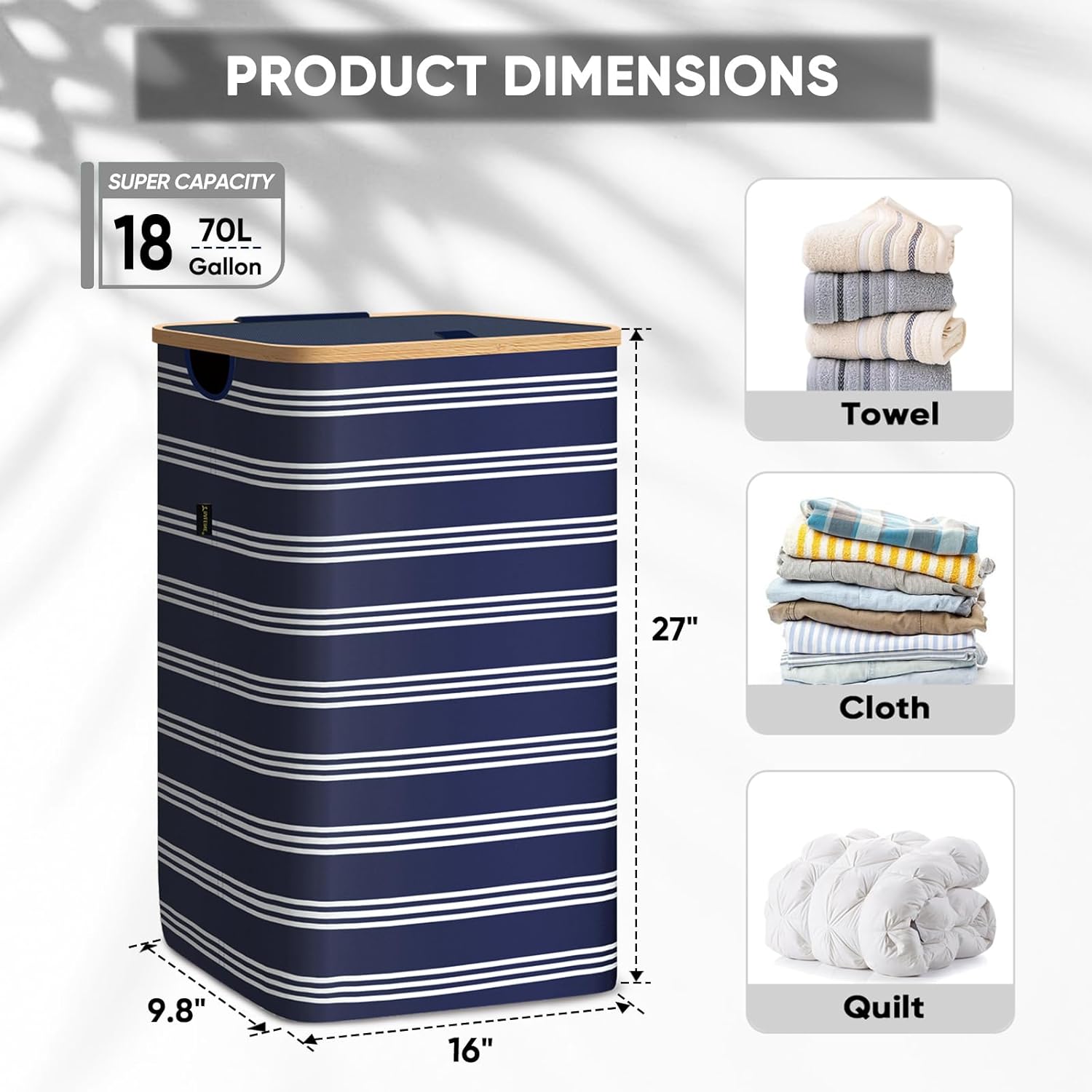 BALEINE Laundry Hamper with Lid, Tall Laundry Baskets with Bamboo Pull Handles, Large Laundry Bin with Internal Support (18 Gal/70L, Blue Pinstripe)