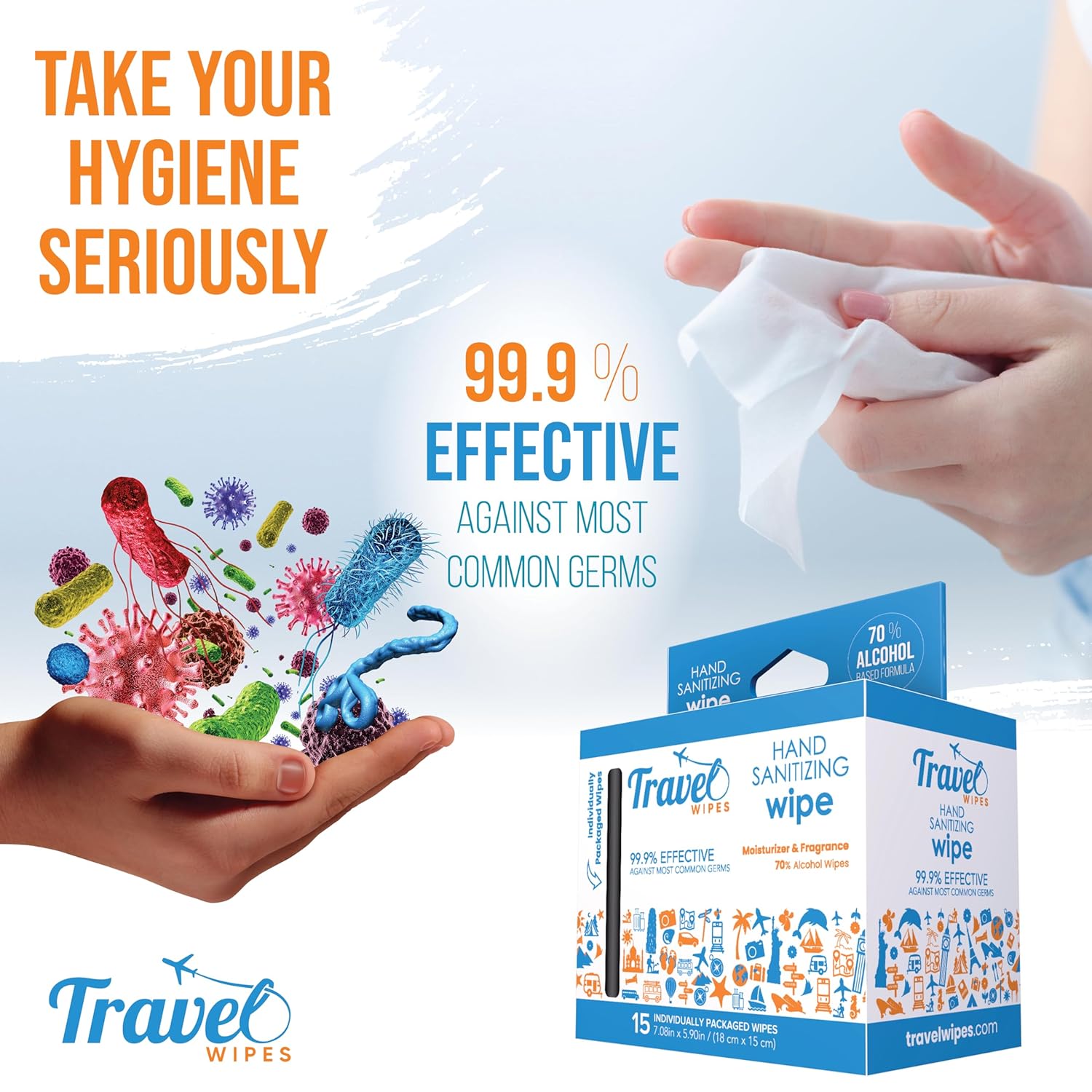 - ULTIMATE TRAVEL COMPANION: Individually wrapped for ultimate convenience, our hand sanitizing wipes are compact, portable, and perfect for on-the-go use. Whether traveling, commuting, or out and about, these wipes fit effortlessly into your bag or pocket—ideal for public transportation, gyms, parks, and more.